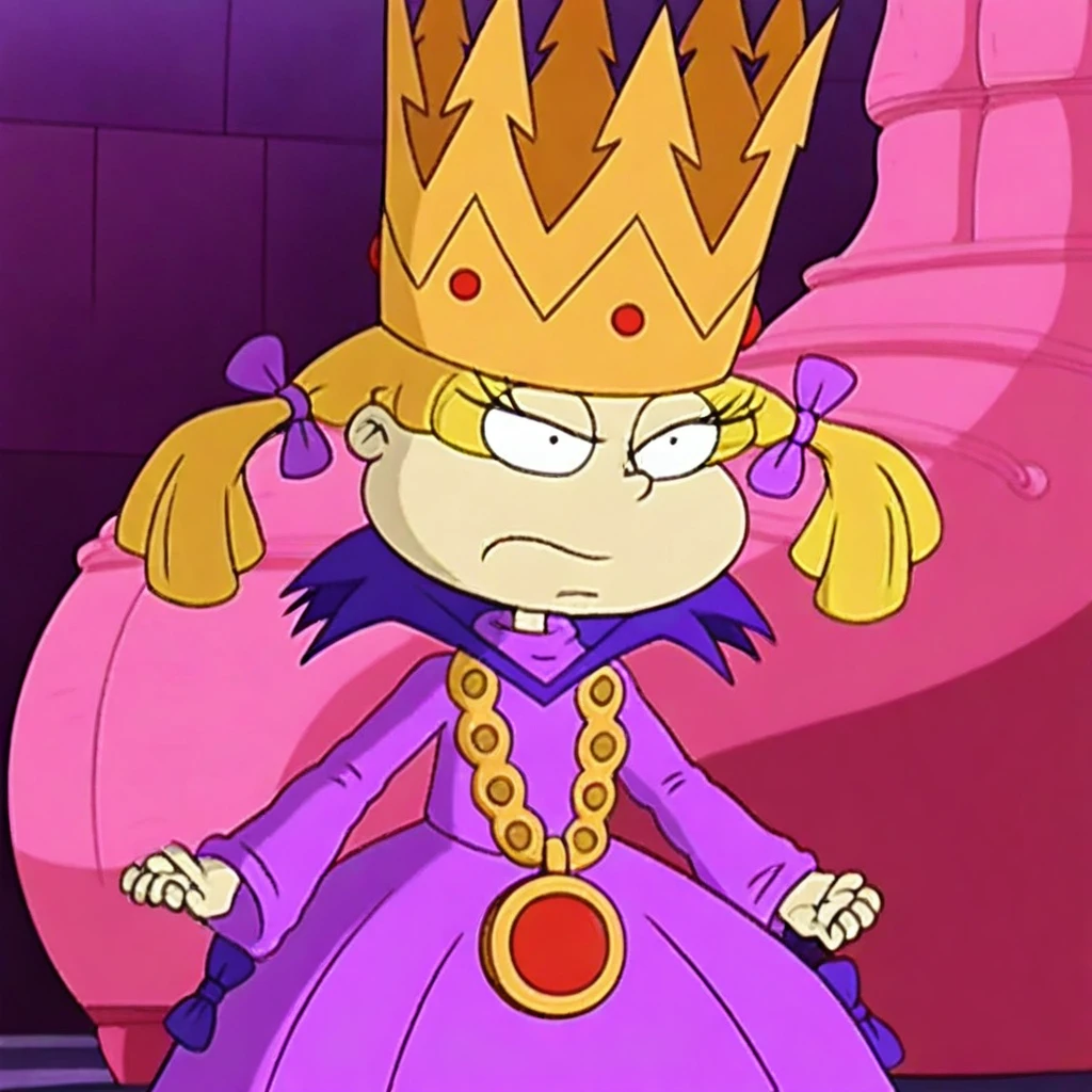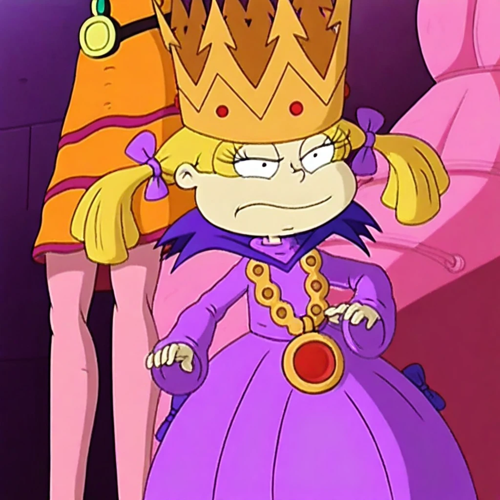 Angelica Pickles, Evil Queen, blonde hair, pigtails tied with purple hair bow, gold-colored crown with a pointed jagged edge on top and three small red circular jewels across the front, long-sleeved purple turtleneck satin ball gown with dark purple ruffle at the bottom, dark purple high collar, gold-colored necklace with large circular orange-red stones linked together. The central stone of the necklace is a larger dark red circle