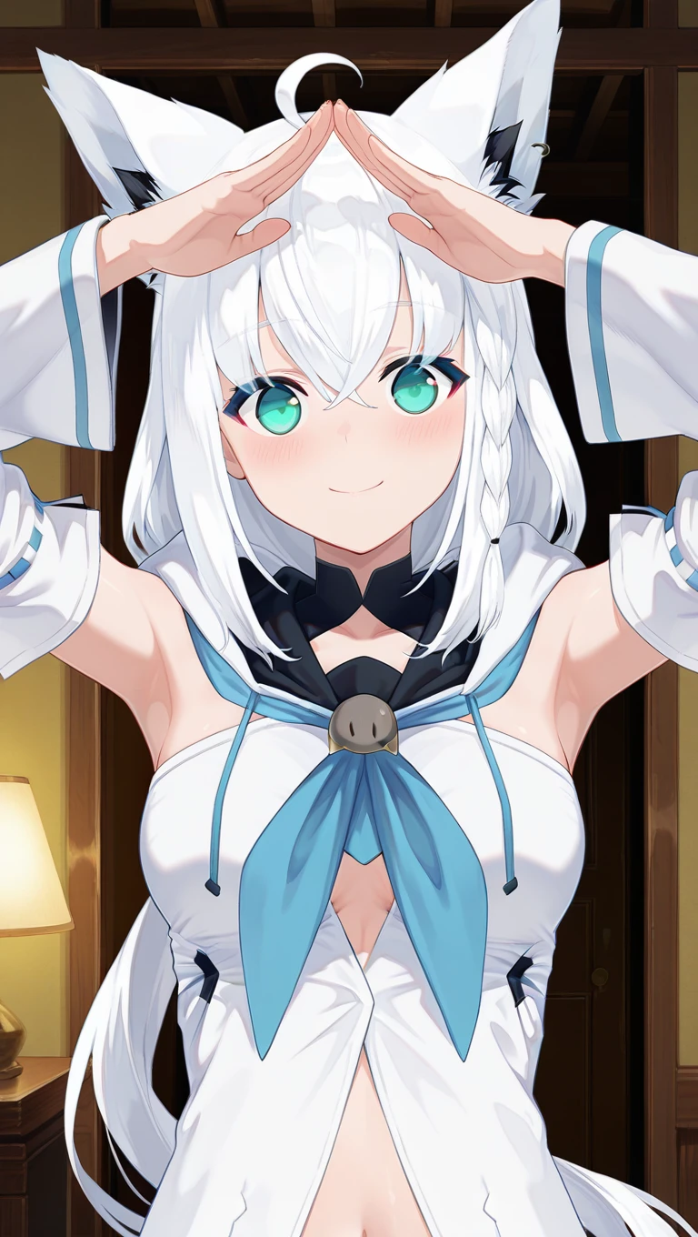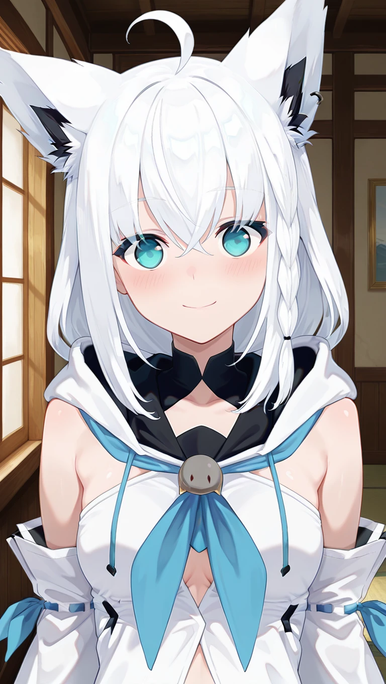 fox ears,animal ear fluff,ahoge,long hair,white hair,single braid,side braid,hair between eyes,aqua eyes