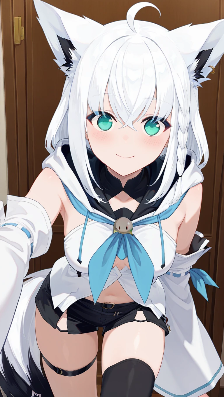 midriff,blue neckerchief,sleeveless shirt,white shirt,detached sleeves,white sleeves,navel,black belt,black shorts,short shorts,fox tail,thigh strap,black thighhighs,single thighhigh,fold-over boots,black footwear