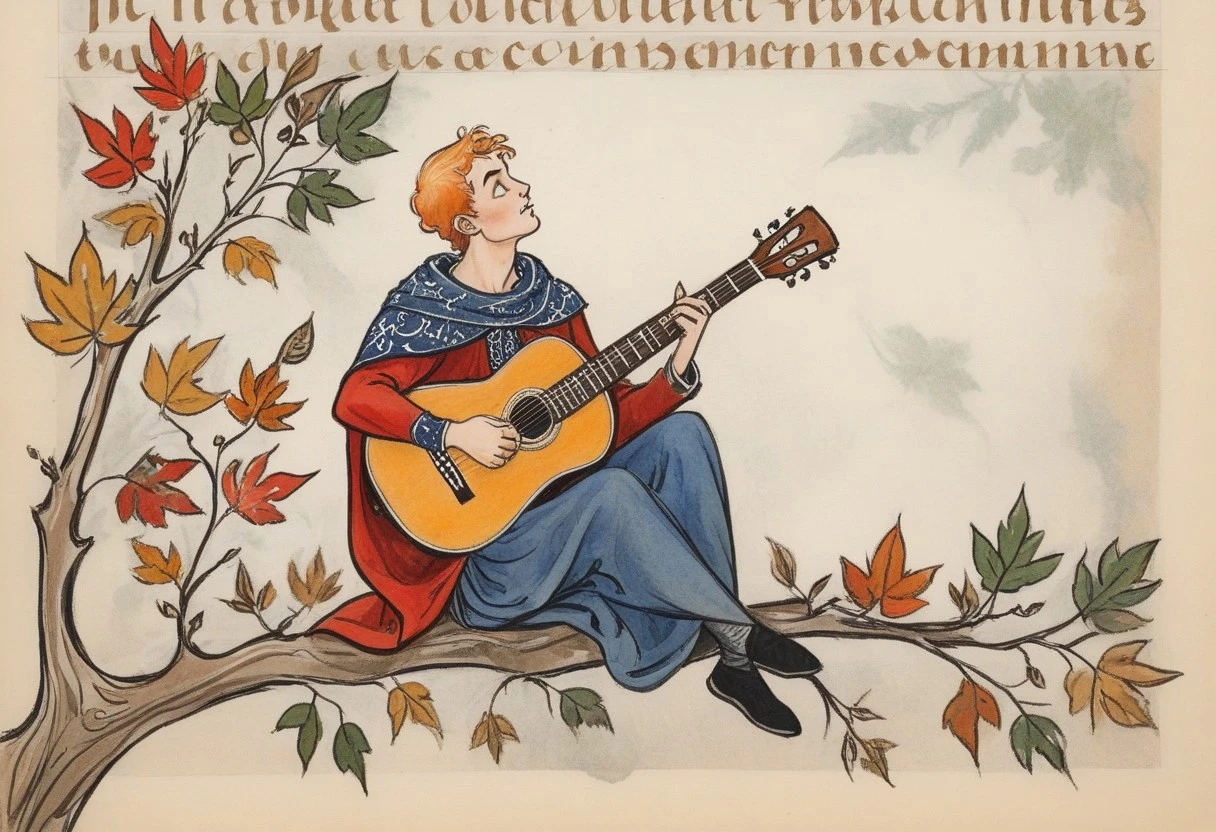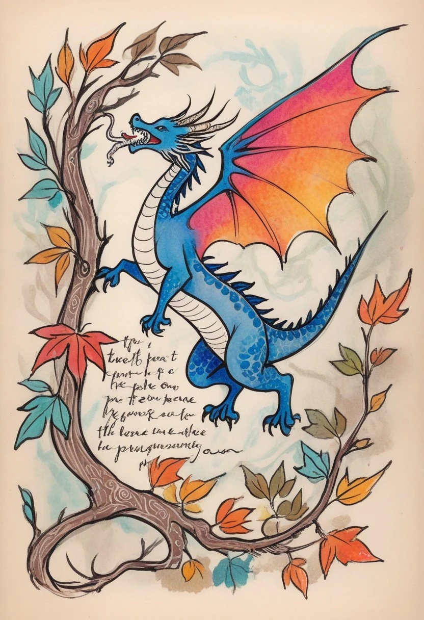 Tags that work: fine art parody, colored ink \(medium\), branch, leaves, text, stylized ???????, paper texture \(traditional media\), faded background, simple background
