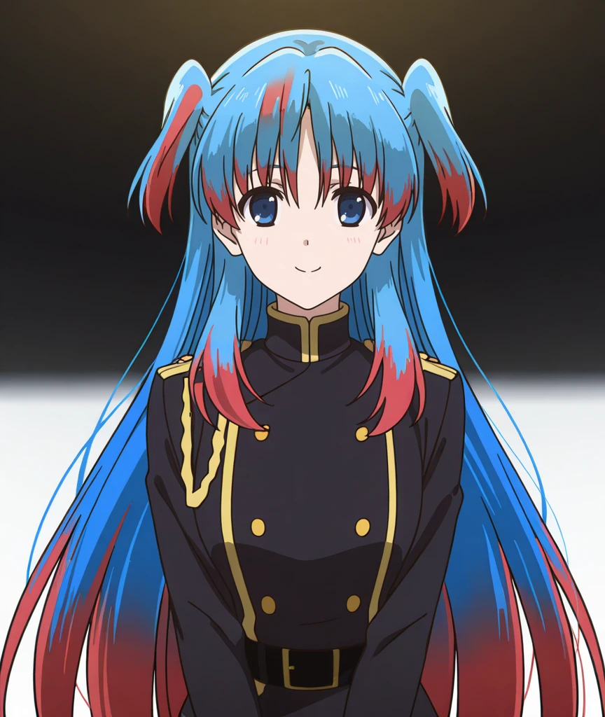 (chtholly nota seniorious,very long hair,blue hair,two side up,bangs,blue eyes),(two-tone hair,multicolored hair,red hair,gradient hair),