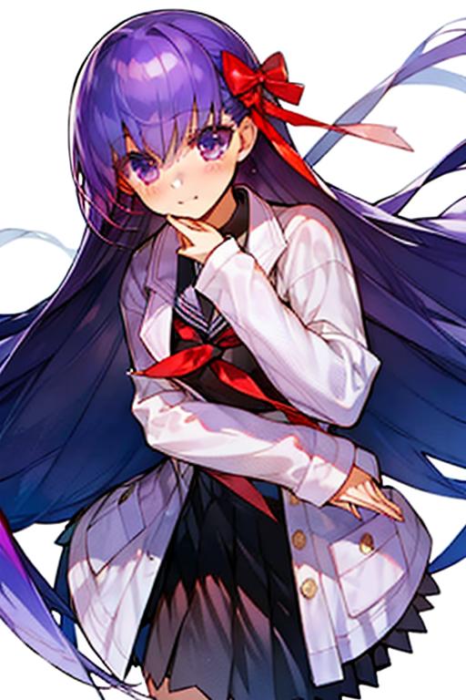 Sakura, 1girl, solo, purple hair, long hair, purple eyes, matou sakura, ribbon, hair ribbon, looking at viewer, school uniform, bow,
