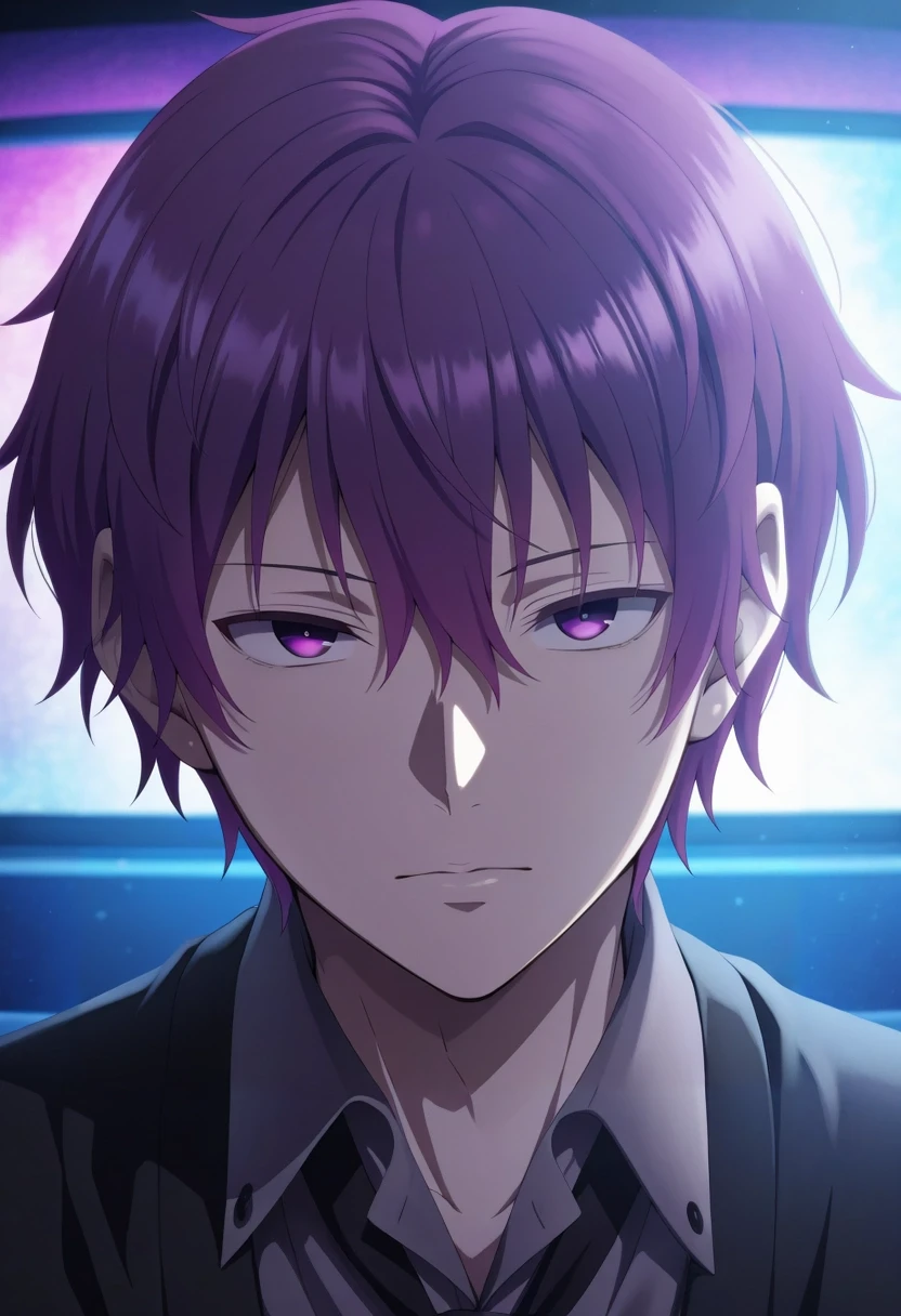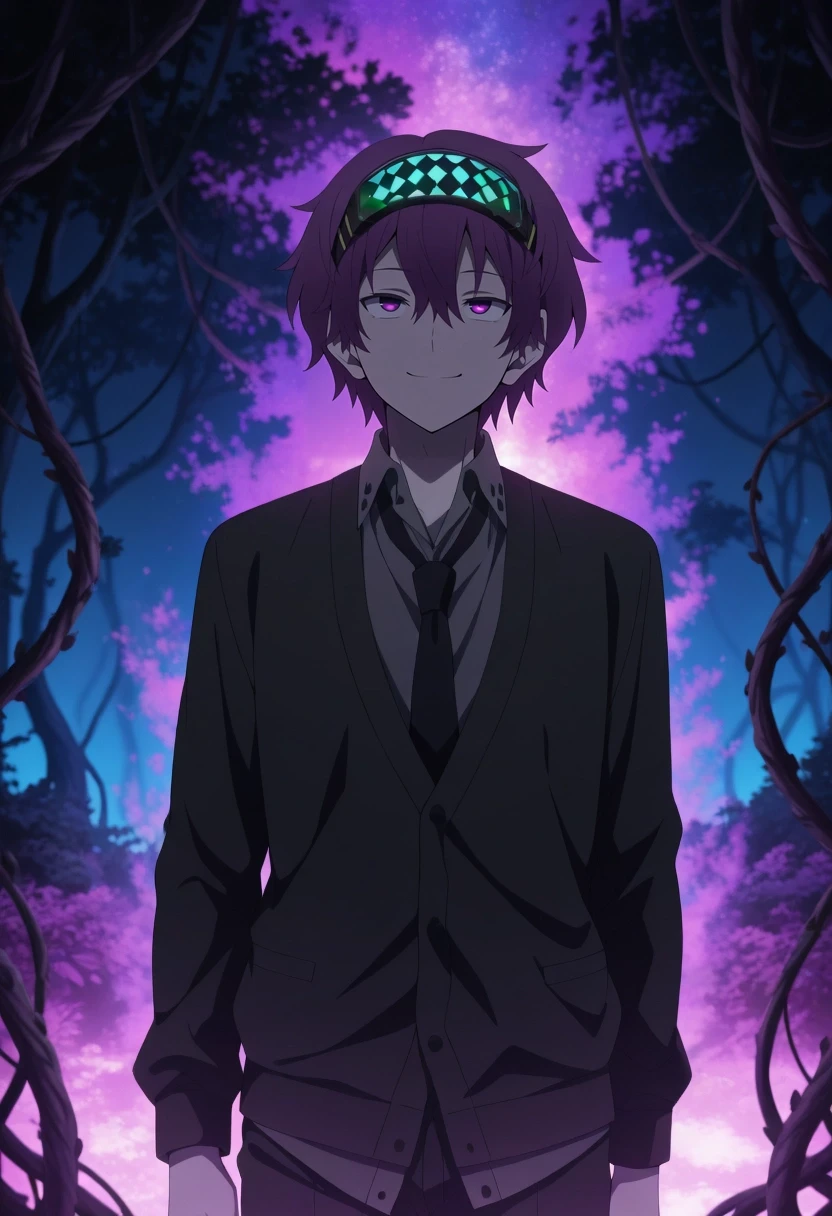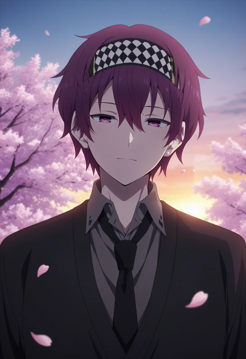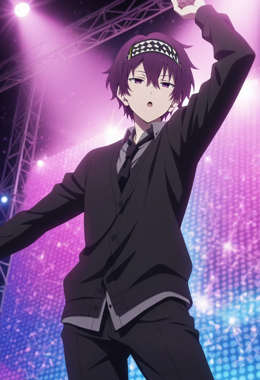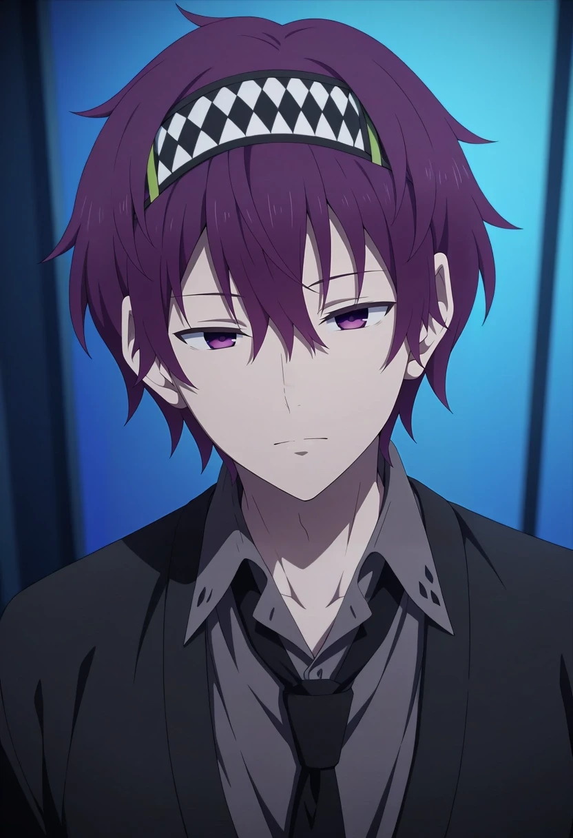 makino_aikawa, purple hair, purple eyes, short hair, hair between eyes, bangs, {hairband|headband|}, {black jacket, grey shirt, collared shirt, black necktie||}