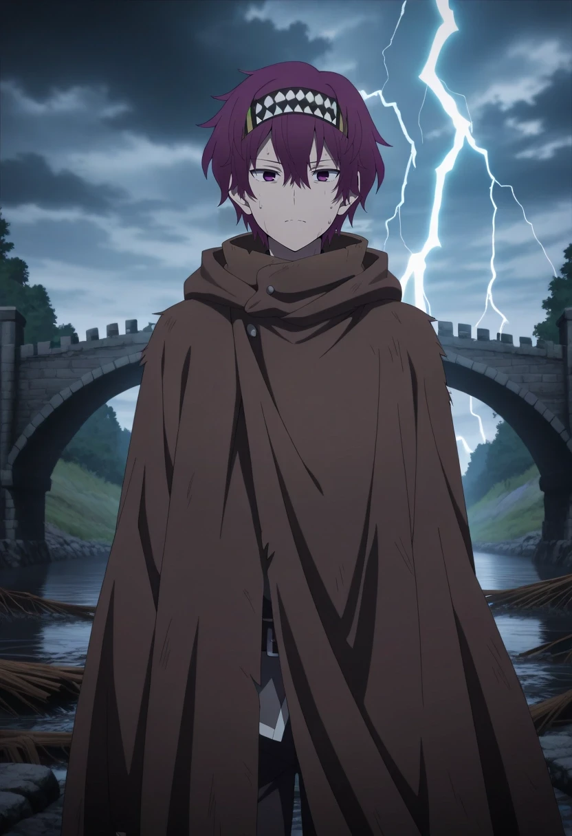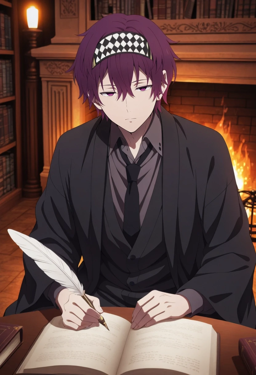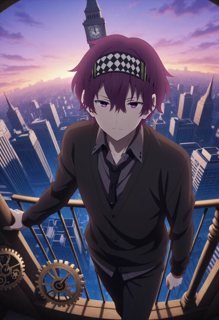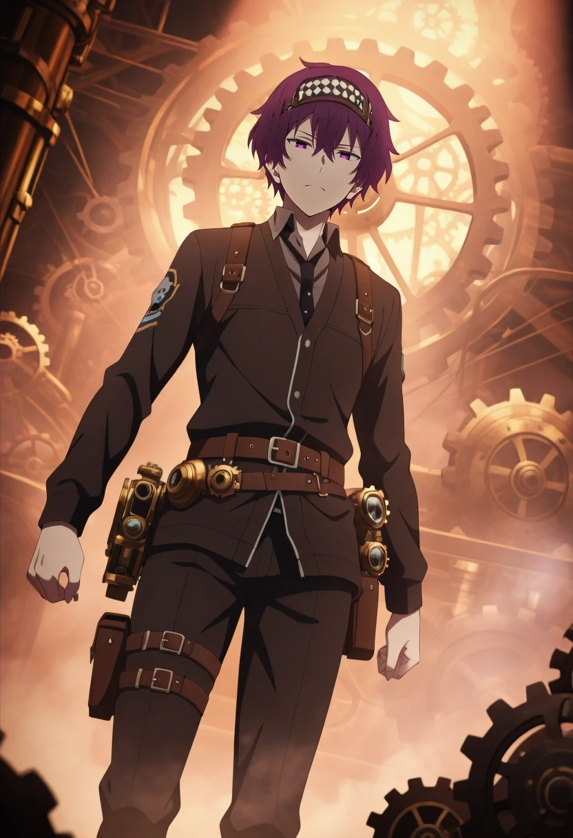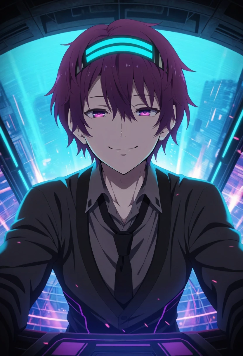 makino_aikawa, purple hair, purple eyes, short hair, hair between eyes, bangs, {hairband|headband|}, {black jacket, grey shirt, collared shirt, black necktie||}