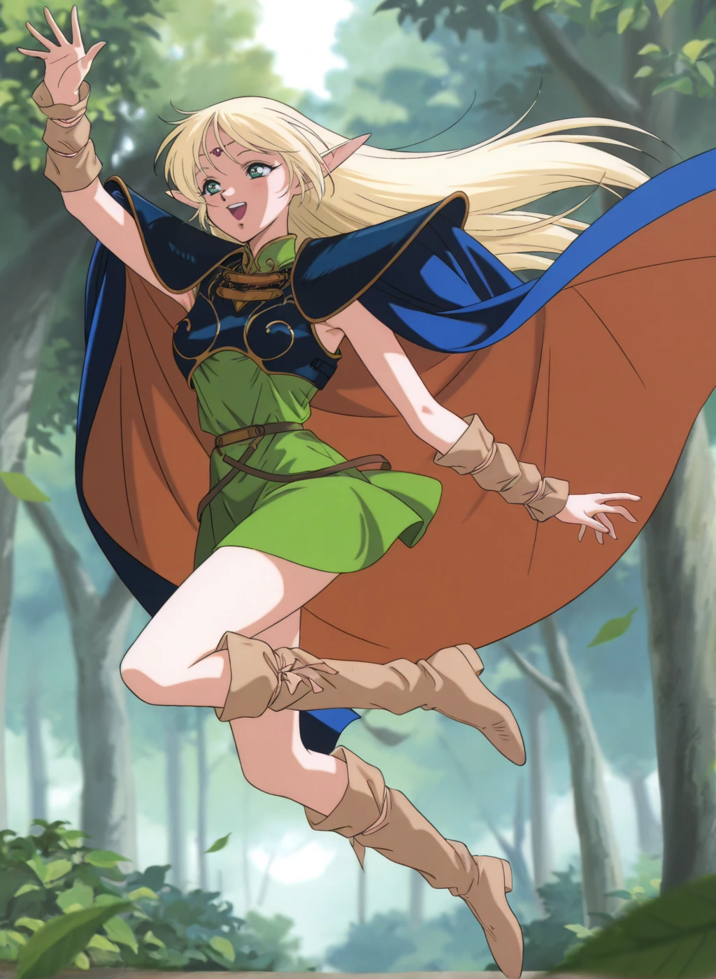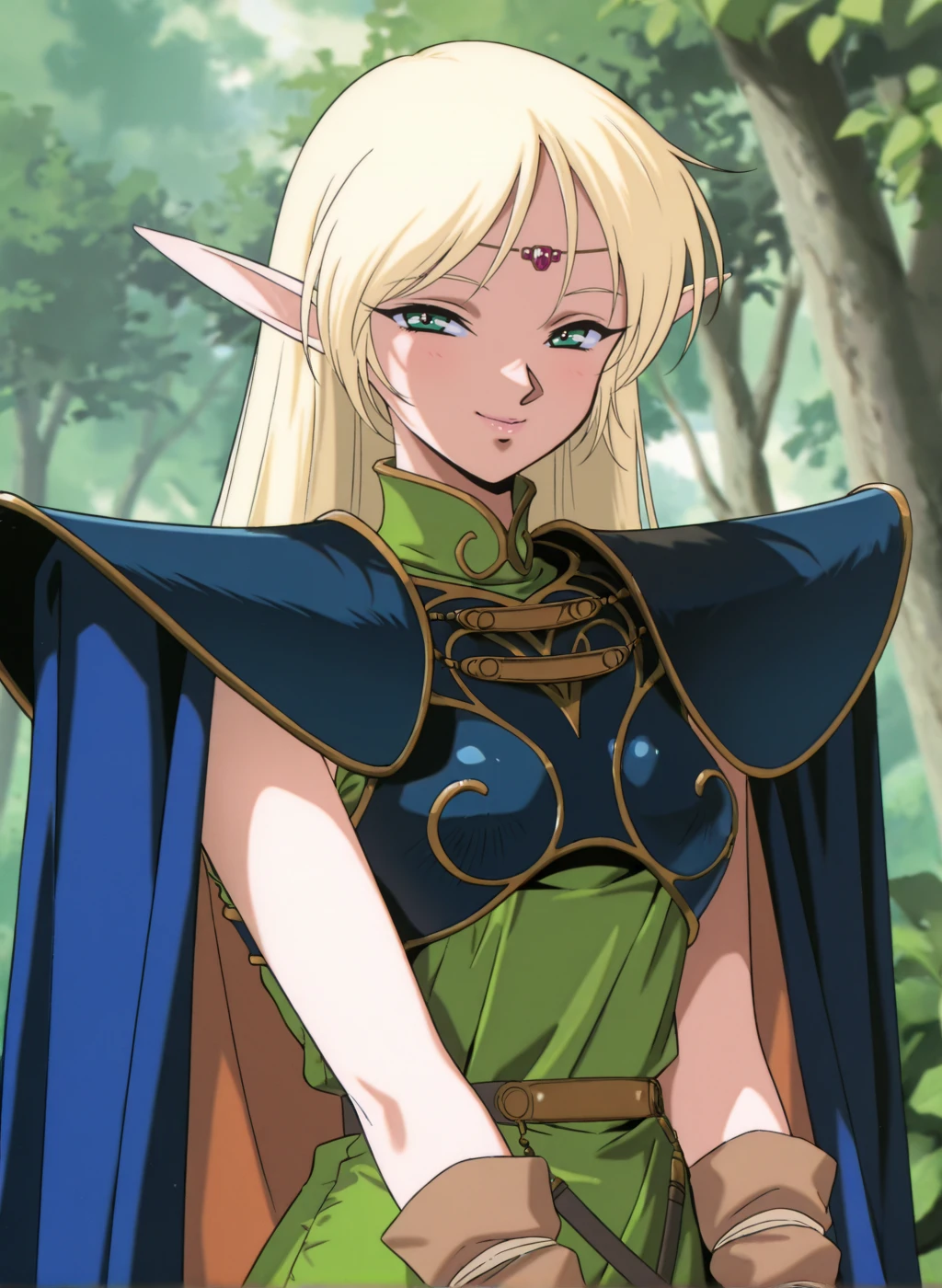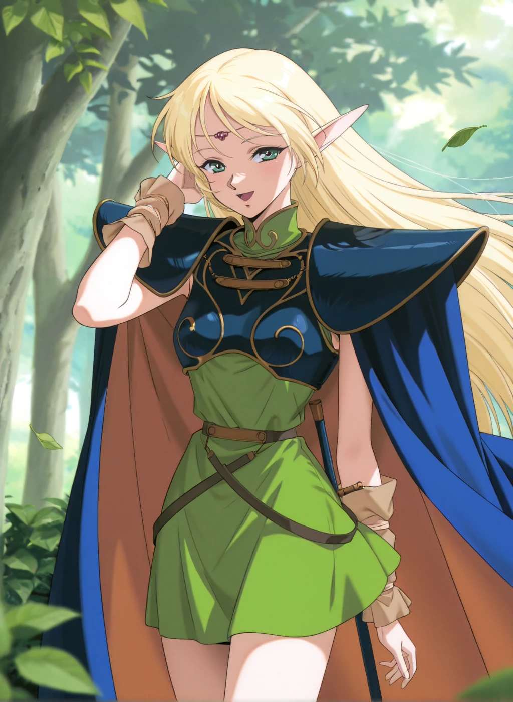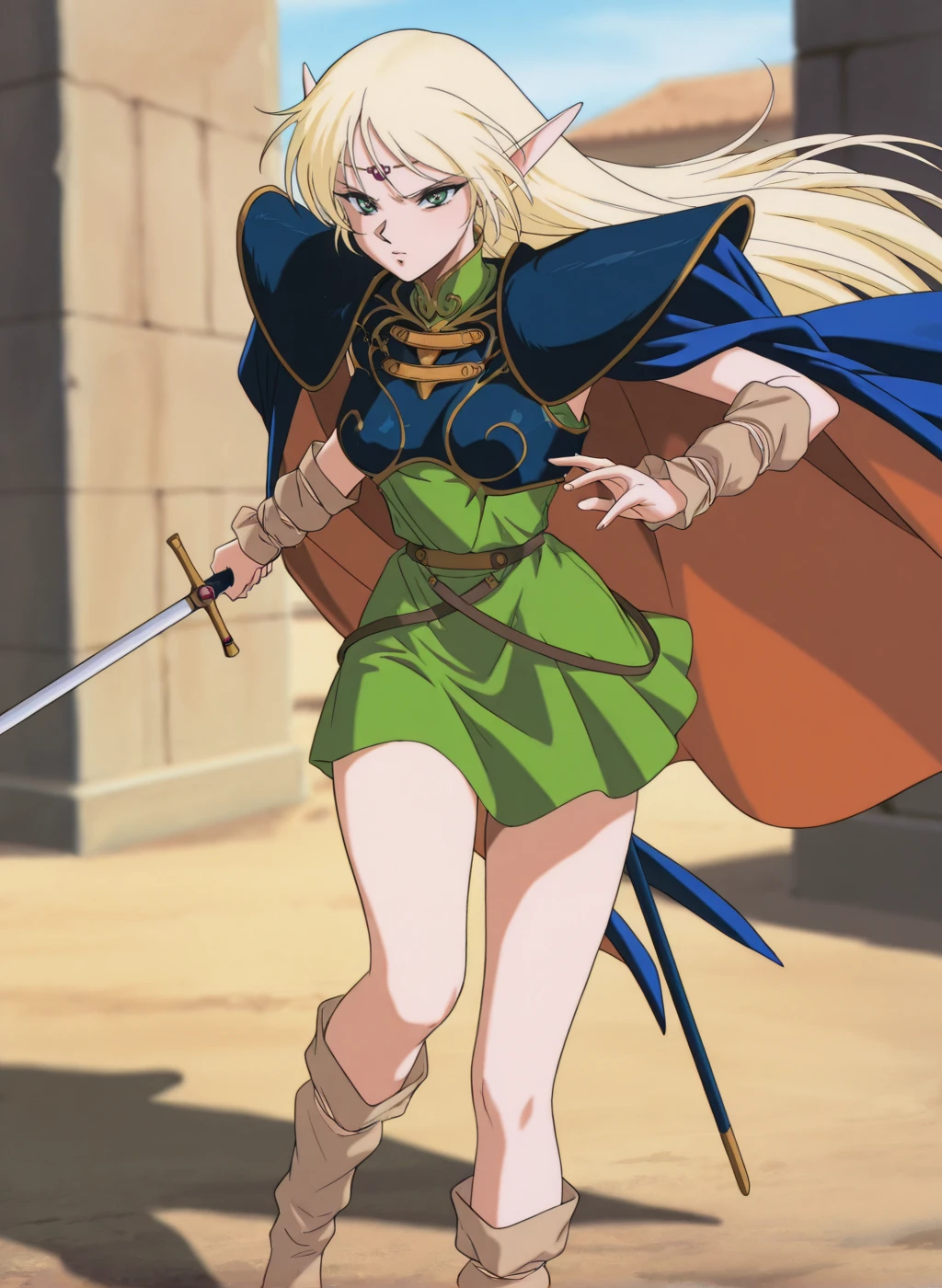 deedlit, blonde hair, pointy ears, long pointy ears, long hair, elf, green eyes,medium breastsOutfit1: