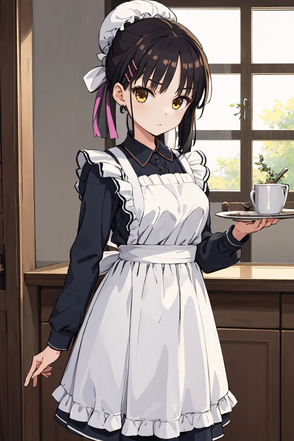 Maid Outfit: hair bun, bun cover, frills, dress, yellow bow, long sleeves, apron