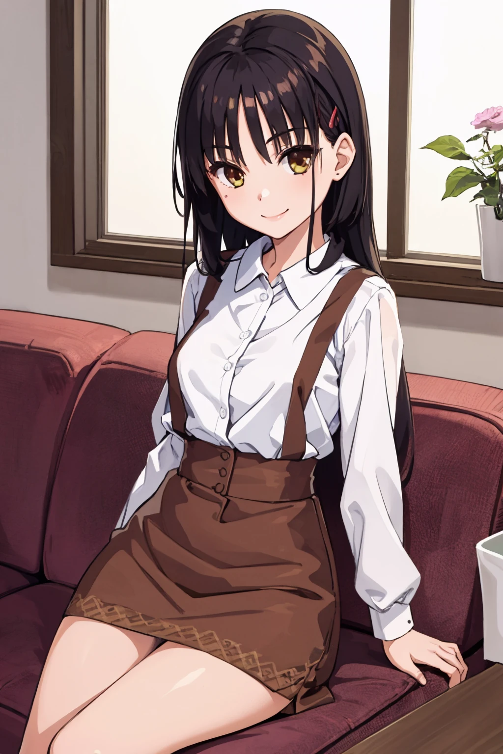 Casual Outfit: white shirt, suspenders, long sleeves, brown skirt