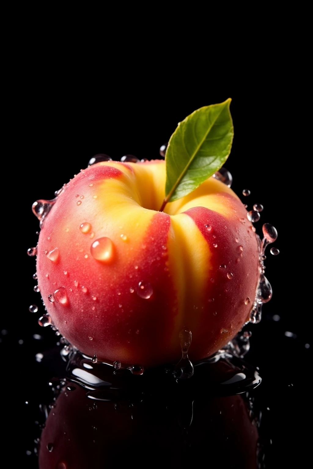 3. With water splashes and droplets, a juicy peach, soft pink - yellow, fuzzy skin, single leaf, black backdrop emphasizing its fresh appeal.
