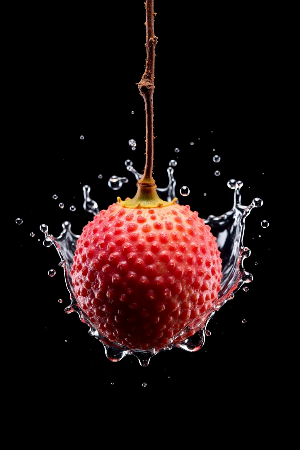 5. With water splashes and droplets, a sweet lychee, rough pink shell, juicy inside hinted, black backdrop for a vivid contrast.