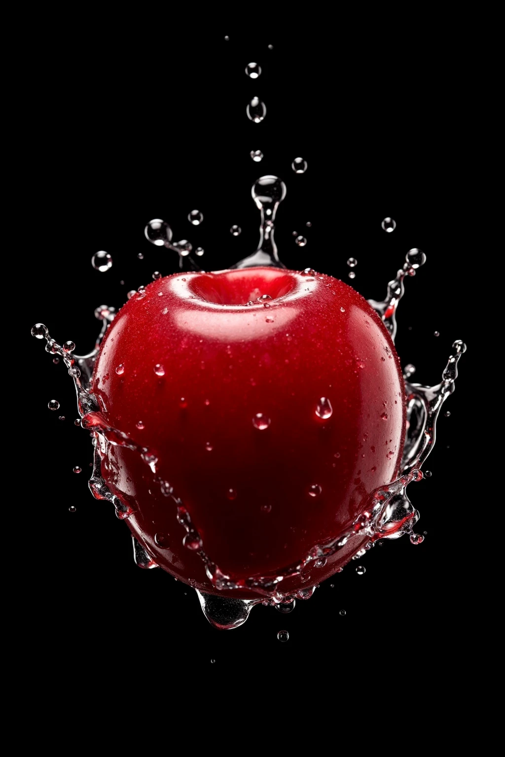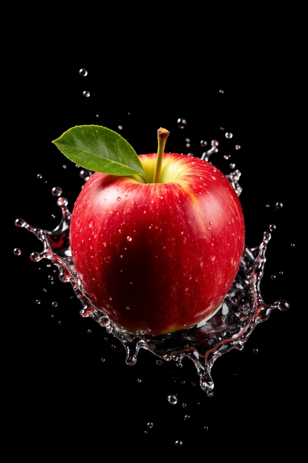 6. With water splashes and droplets, a crisp apple, red - green hue, shiny peel, leafy top, black background to highlight freshness.