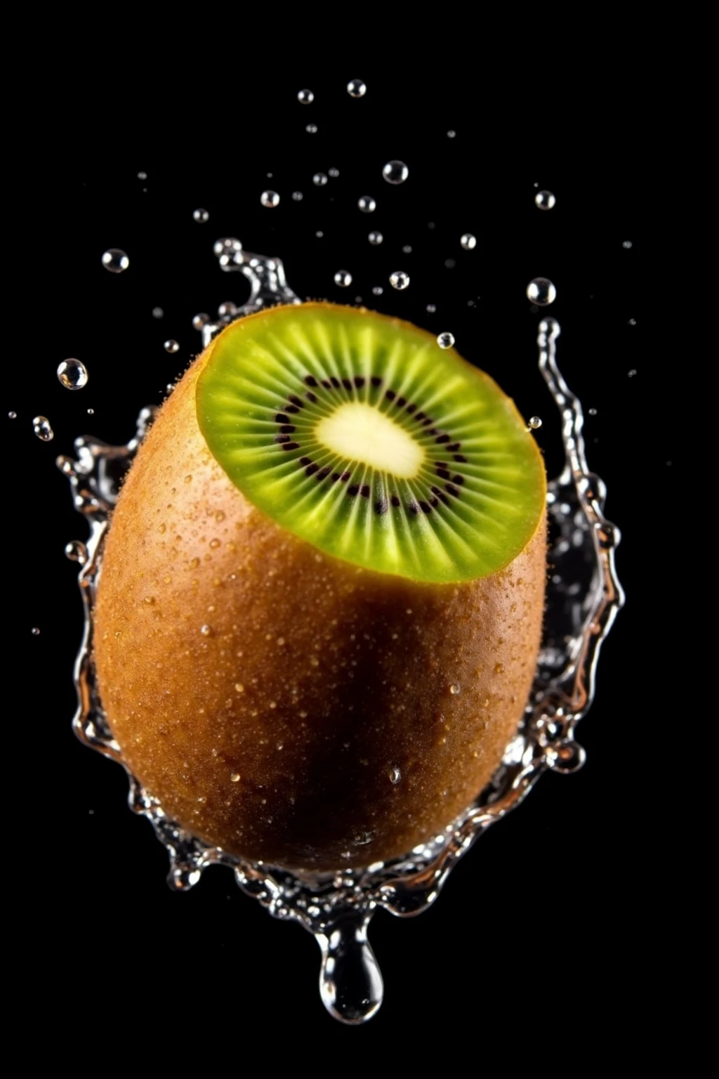 8. With water splashes and droplets, a succulent kiwi, brown fuzzy skin, green flesh peeking, black background to emphasize texture.