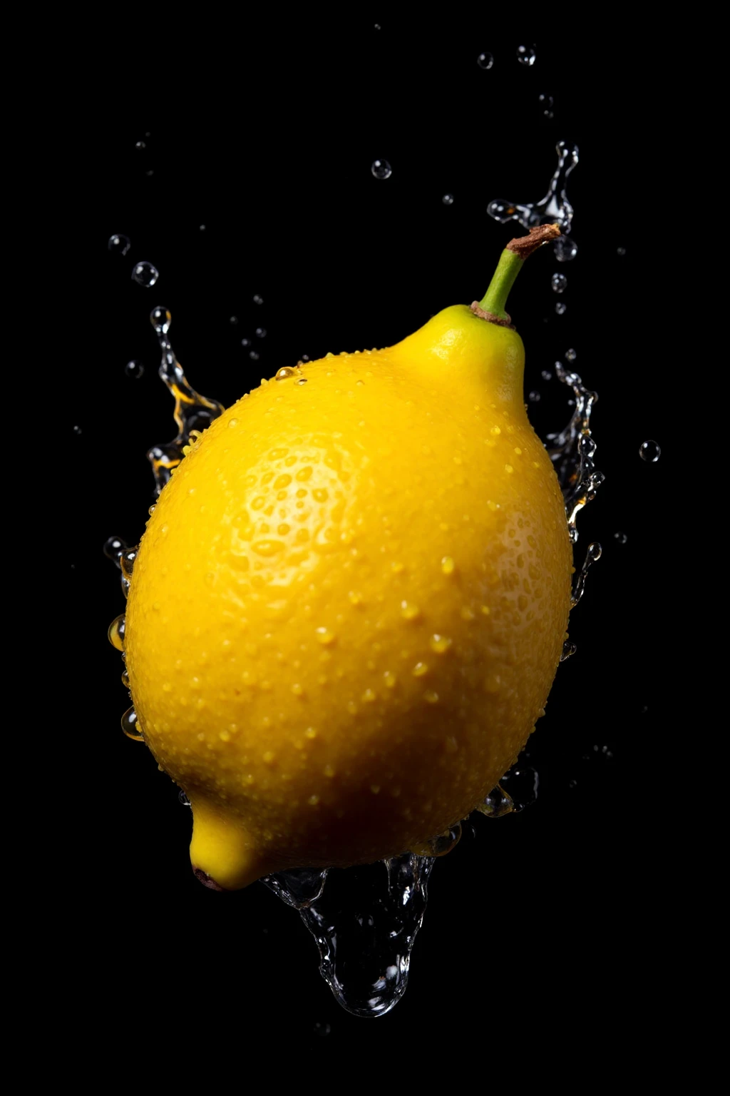 4. With water splashes and droplets, a tangy lemon, bright yellow, textured rind, stem on, black background to showcase its zesty look.