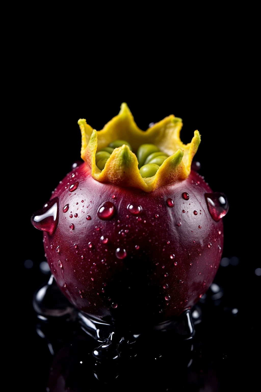 7. With water splashes and droplets, a fragrant passion fruit, wrinkled purple skin, seeds inside suggested, black backdrop for depth.