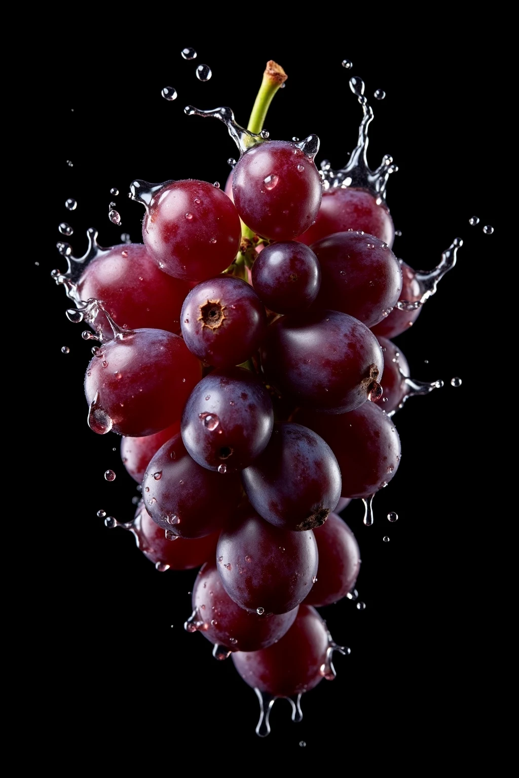 2. With water splashes and droplets, a bunch of grapes, deep purple, plump, cascading slightly, black background highlighting their glossy texture.