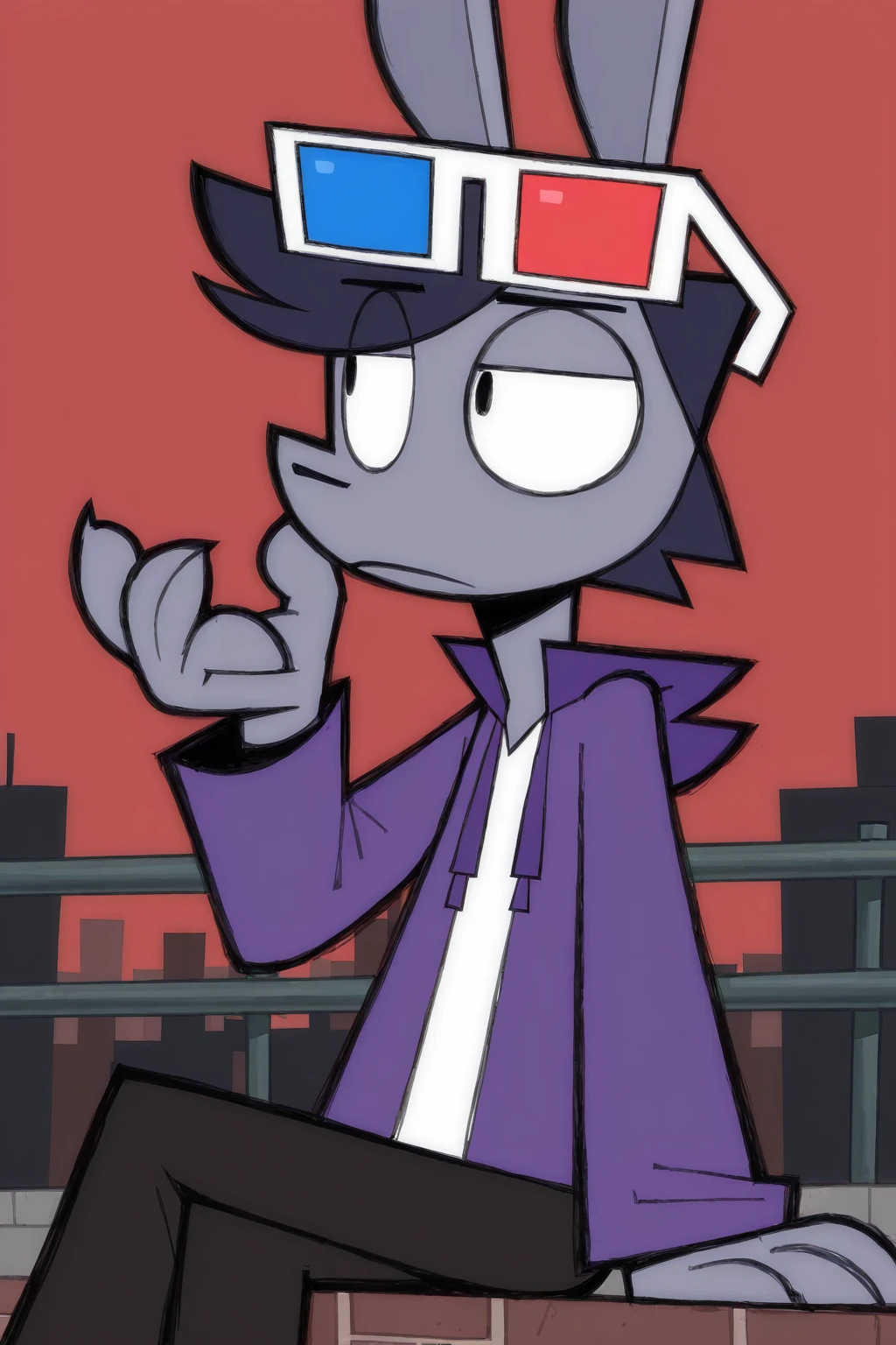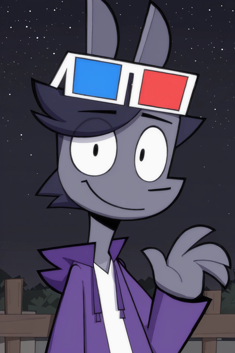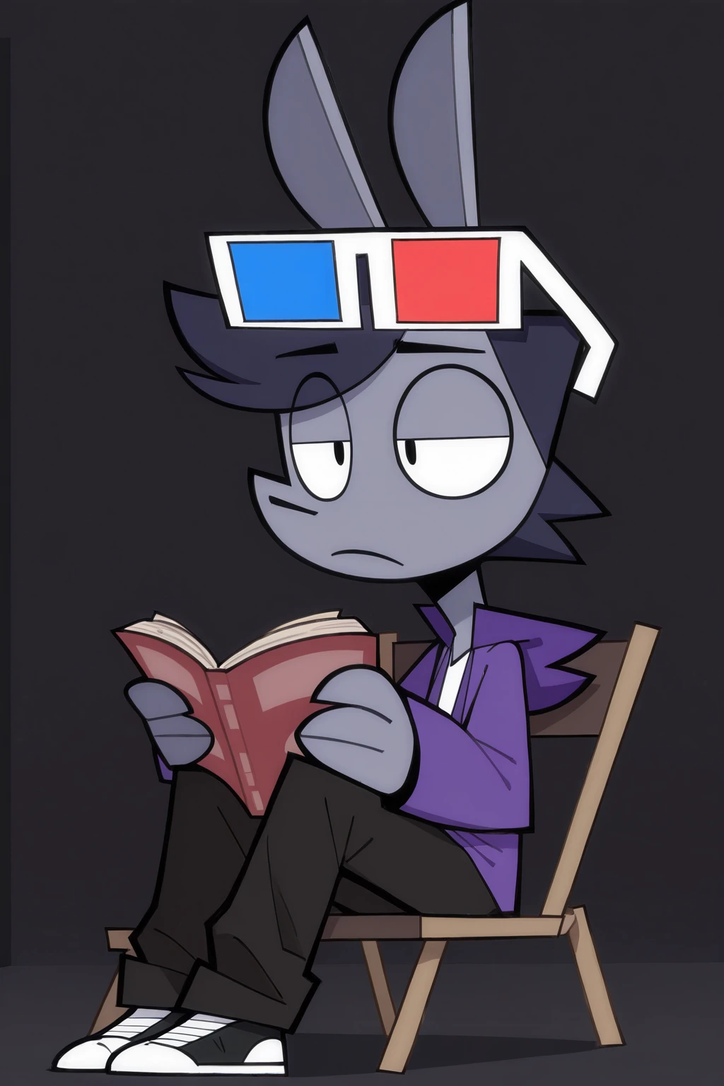 Helpful: 1boy, furry, hoodie, white shirt, 3d-glasses on head, pants, shoes