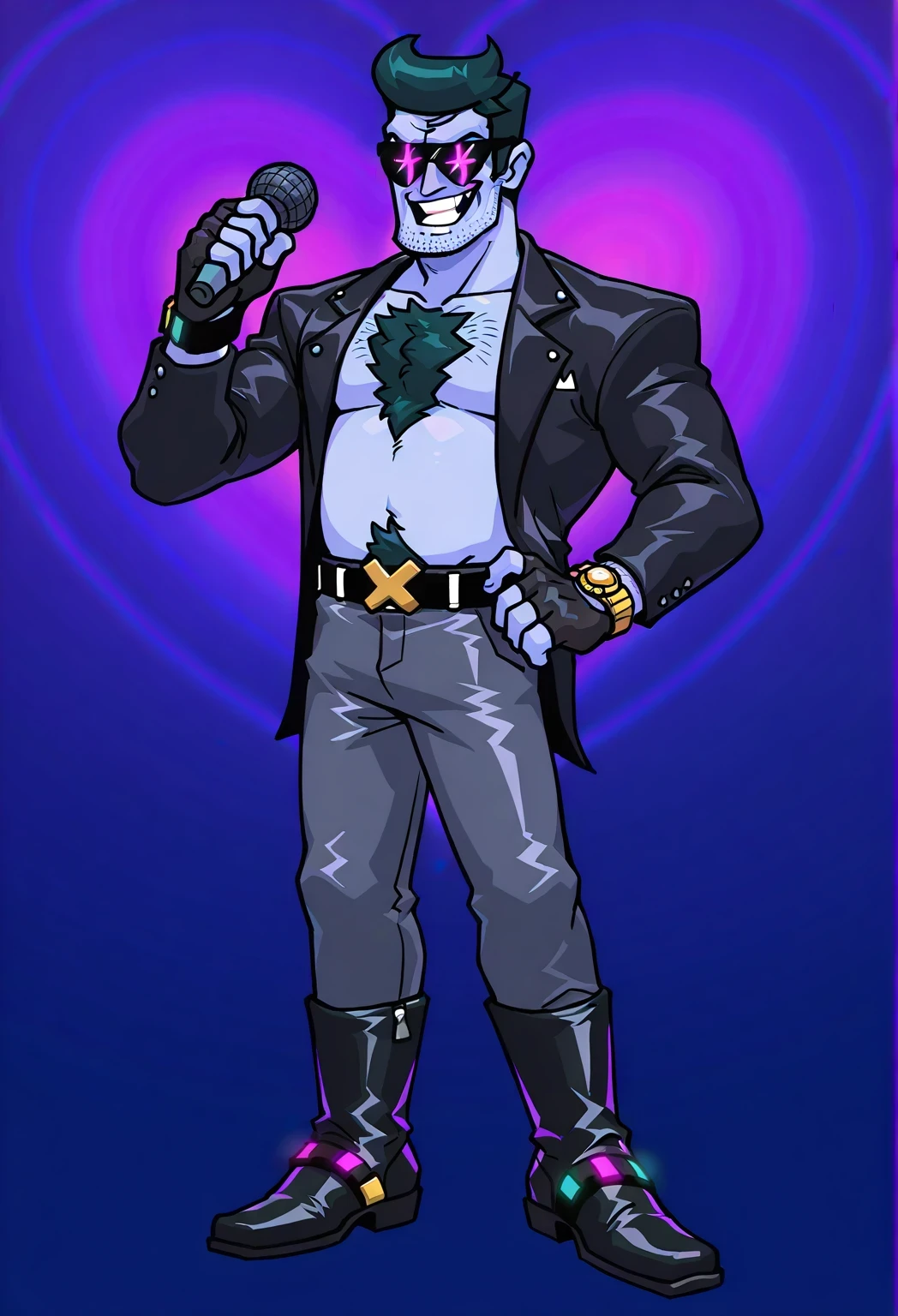 NeoDaddyDearest, 1boy, light blue skin, slick dark teal hair, black sunglasses, pink-magenta eyes, golden watch, black fingerless gloves with pink x symbols, black jacket adorned with neon accents, black belt, gray pants, stubble, chest hair, black boots