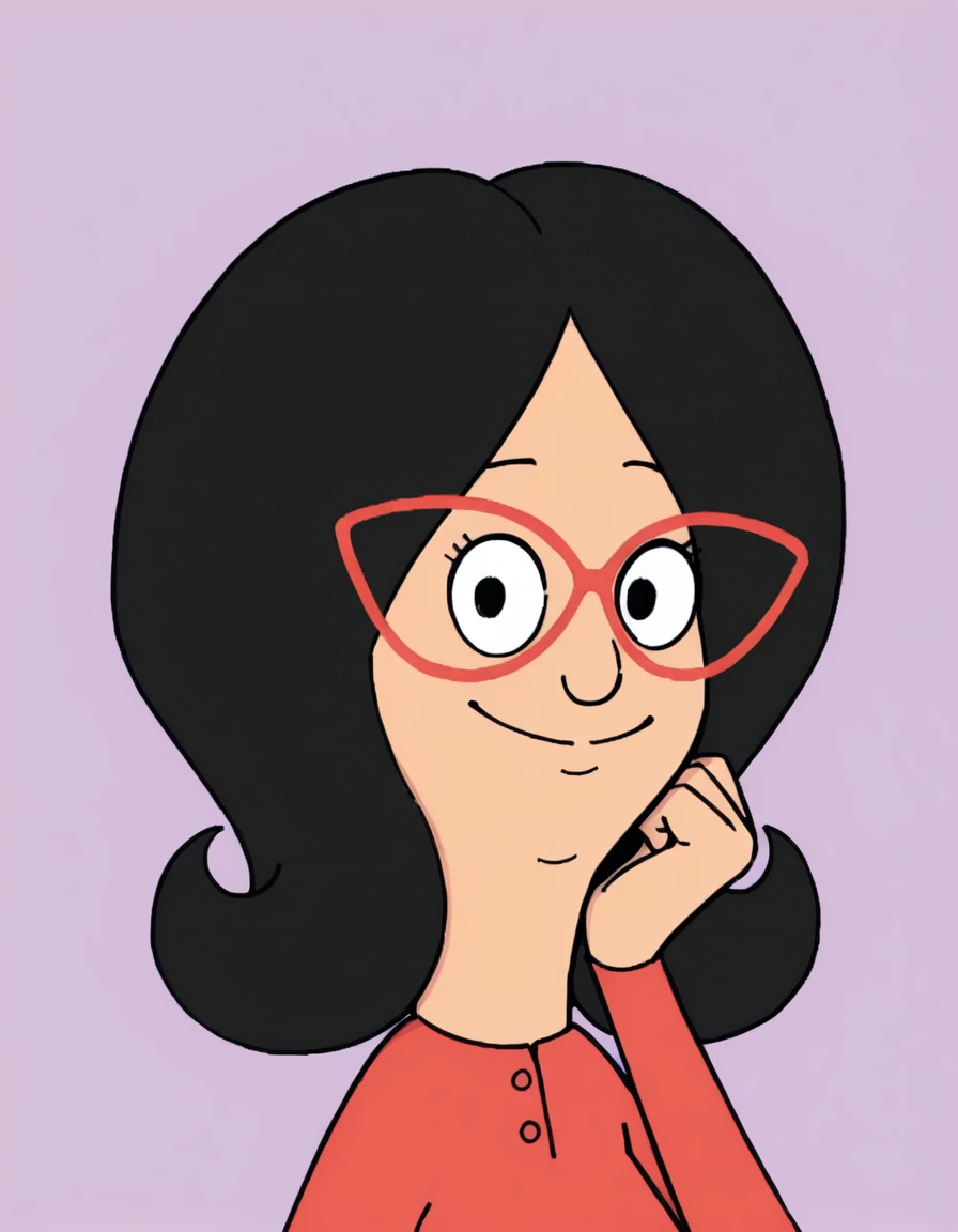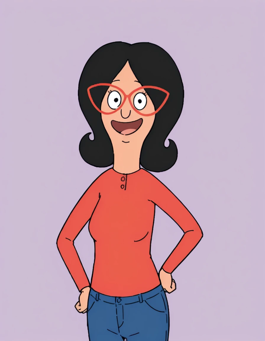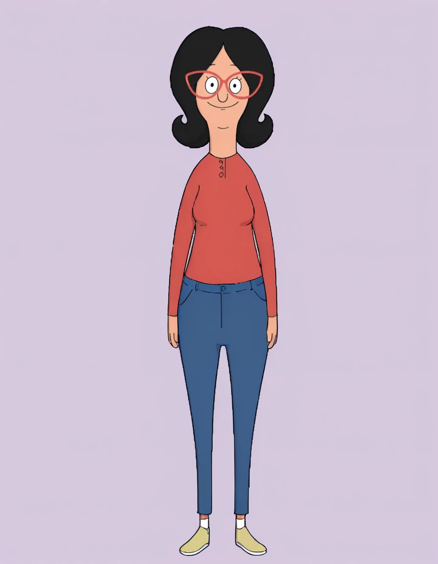 linda, 1girl, black hair, solo, glasses, red shirt, pants, long sleeves, jeans, black eyes,shoes