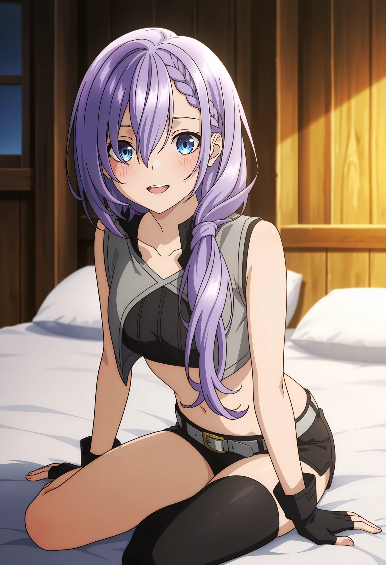 grey vest, crop top, fingerless gloves, grey belt, short shorts, black shorts, single thighhigh