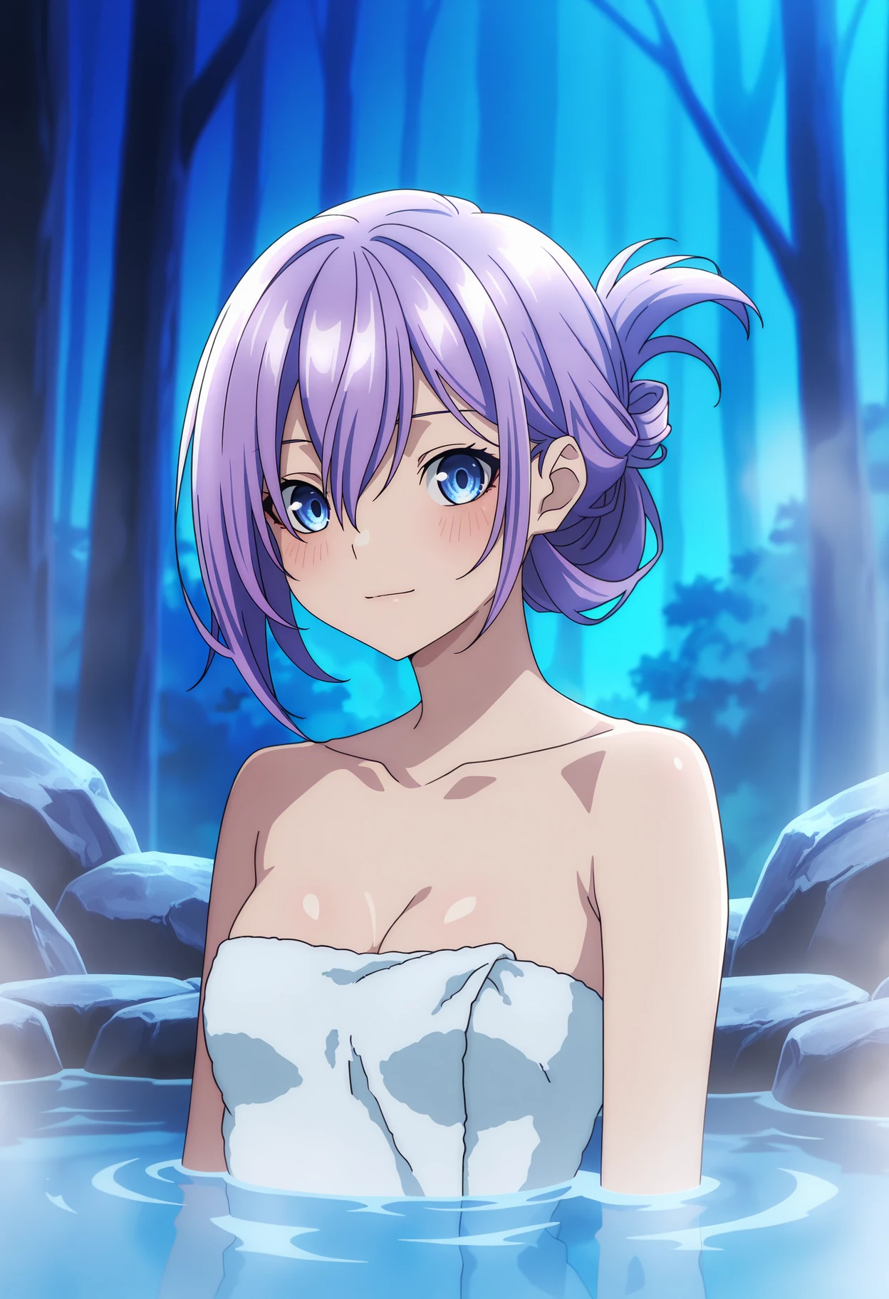 folded ponytail, long hair, hair between eyes, purple hair, blue eyes