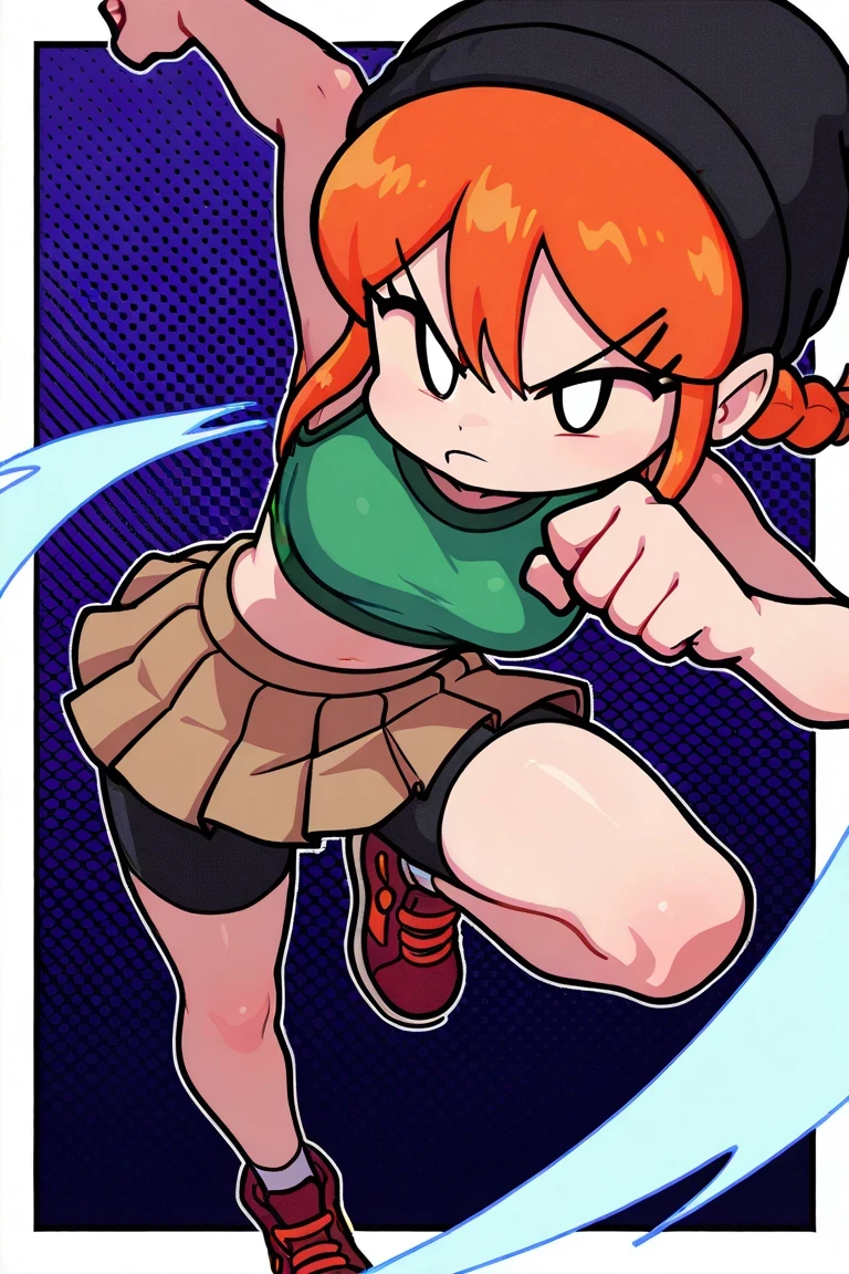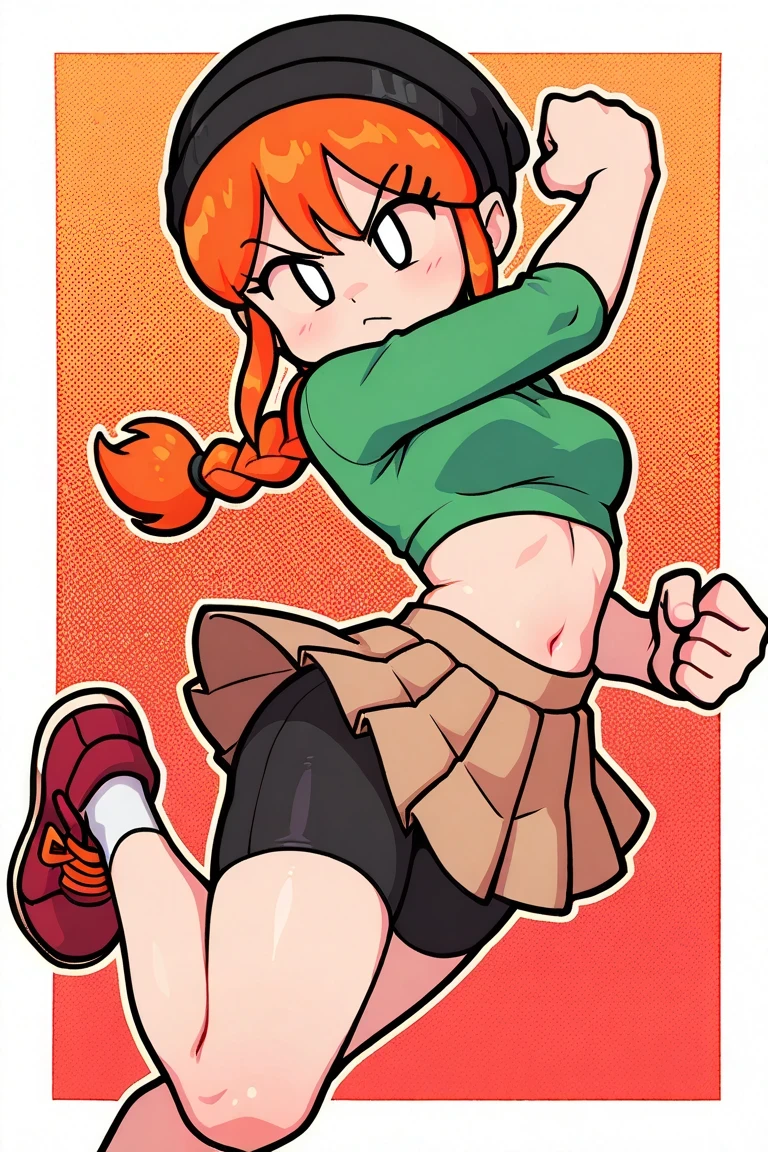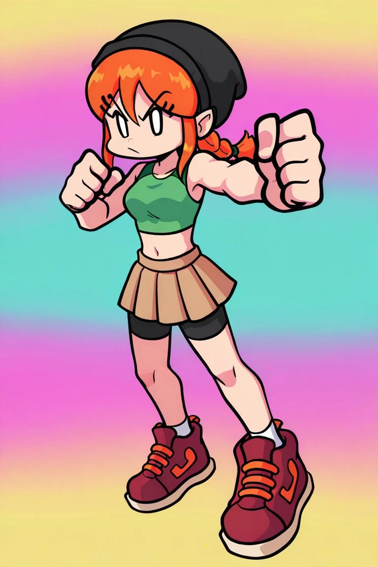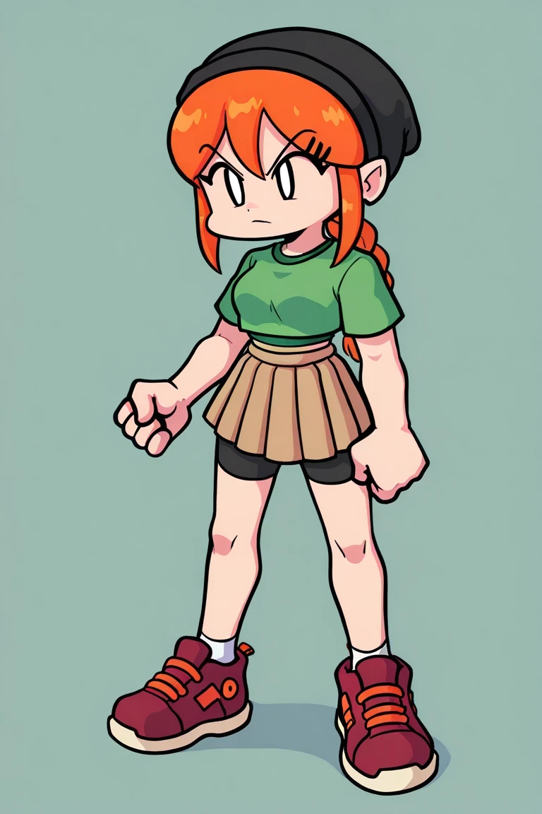 PicaFNF, 1girl, vibrant orange hair, black beanie, sharp white eyes, no sclera, green crop top, beige pleated skirt, black shorts, maroon sneakers