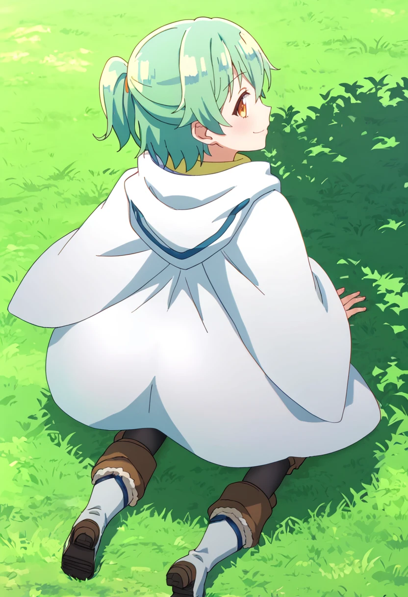 ivy-default, ivy \(saijaku tamer\),orange eyes,green hair,short_hair,short ponytail,(white cloak,white cape:1.2),(yellow shirt,long sleeves,blue skirt:0.6),black pantyhose,(fur trim boots:1.2), shoulder bag