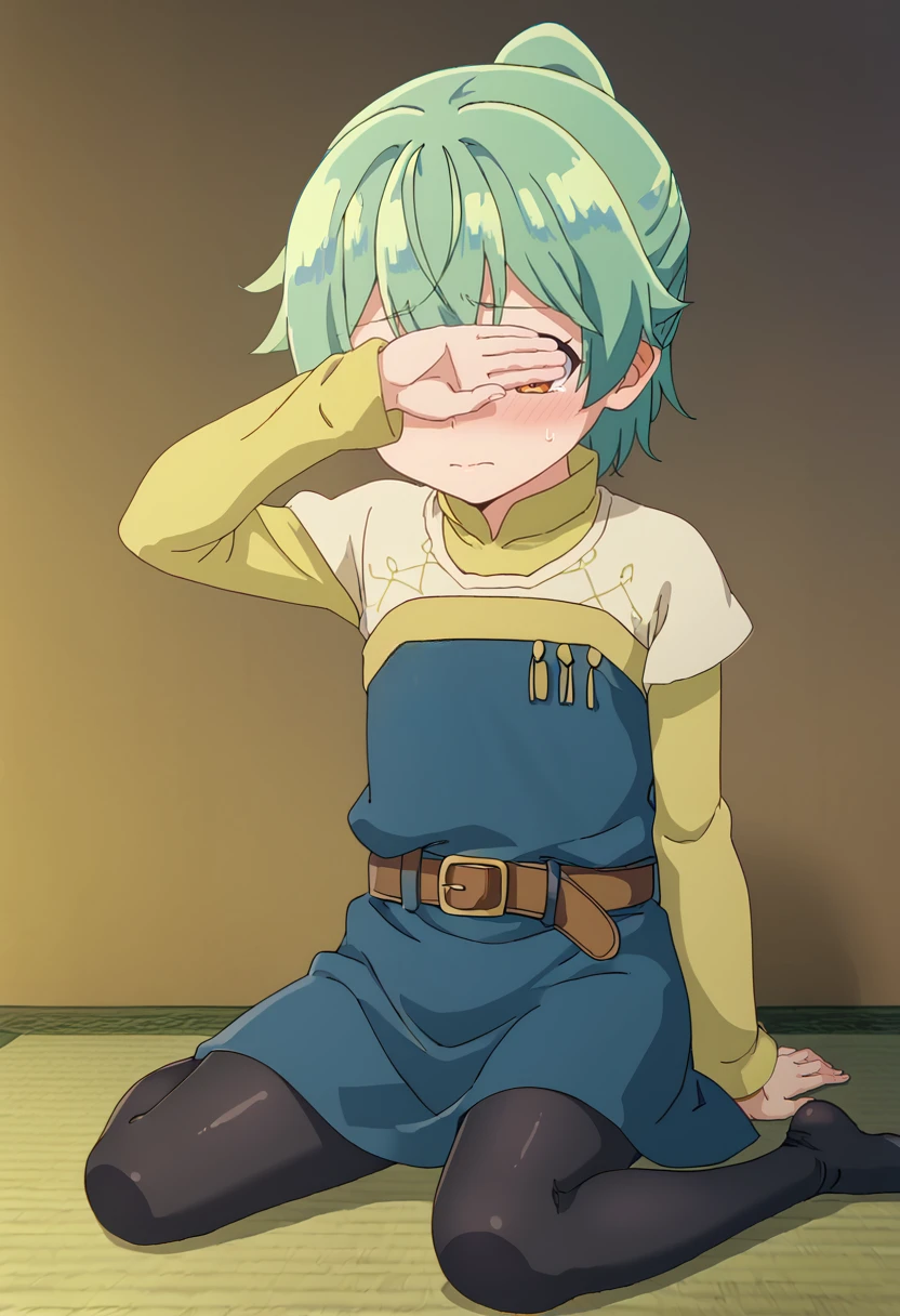 (ivy-cloakless:1.2),ivy \(saijaku tamer\),orange eyes,green hair,short_hair,short ponytail,yellow_shirt,layered sleeves,long sleeves,belt,blue_dress,black pantyhose,(fur trim boots:1.2)