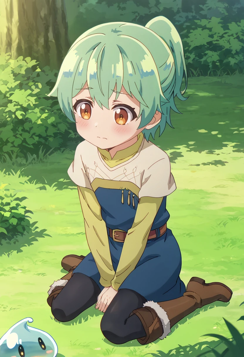ivy \(saijaku tamer\),orange eyes,green hair,short_hair,short ponytail,(white cloak,white cape:1.2),(yellow shirt,long sleeves,blue skirt:0.6),black pantyhose,(fur trim boots:1.2), shoulder bag