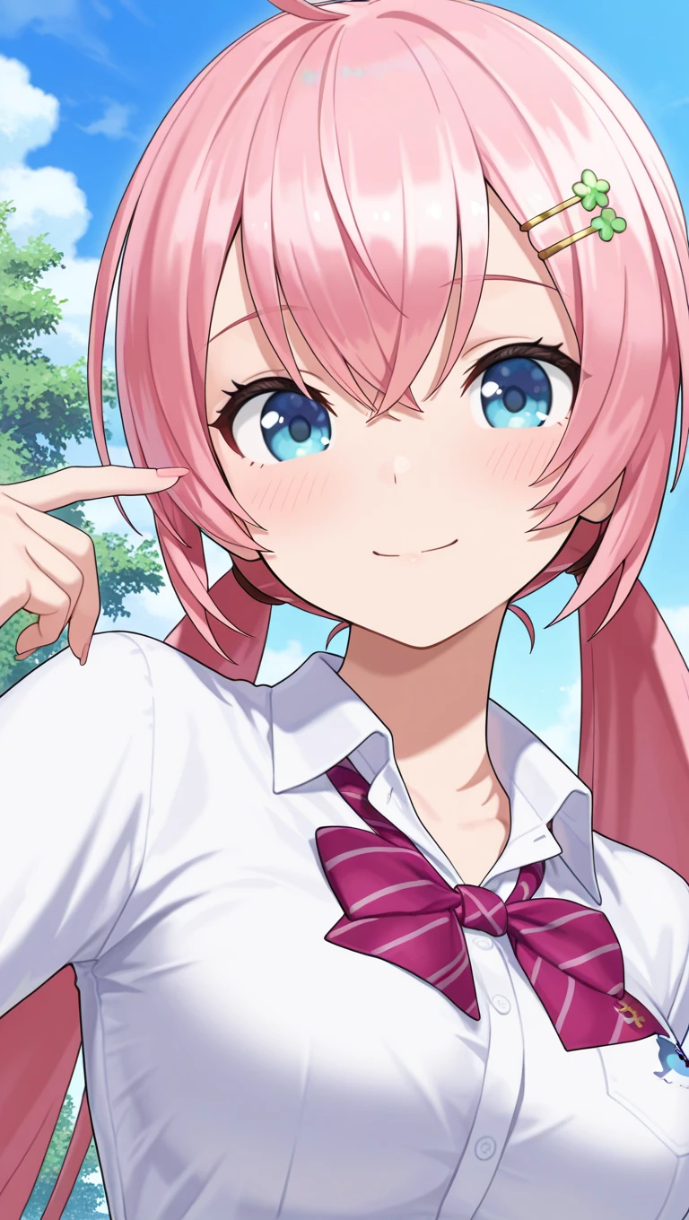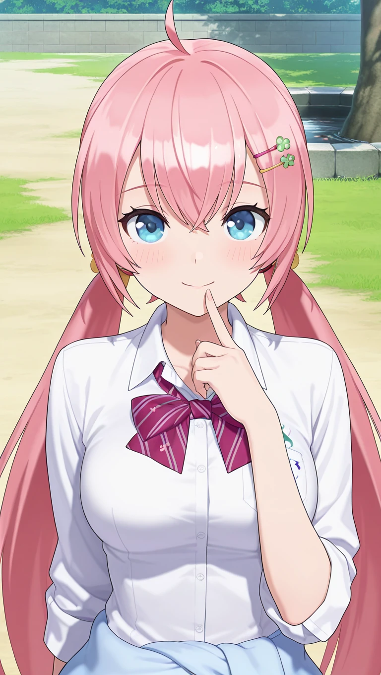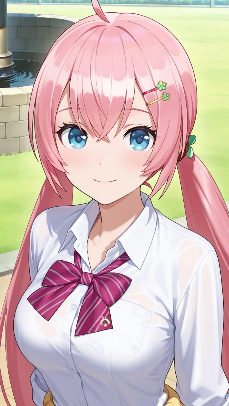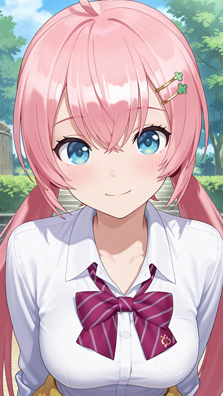 ahoge,long hair,pink hair,low twintails,hair ornament,hairclip,hair between eyes,blue eyes