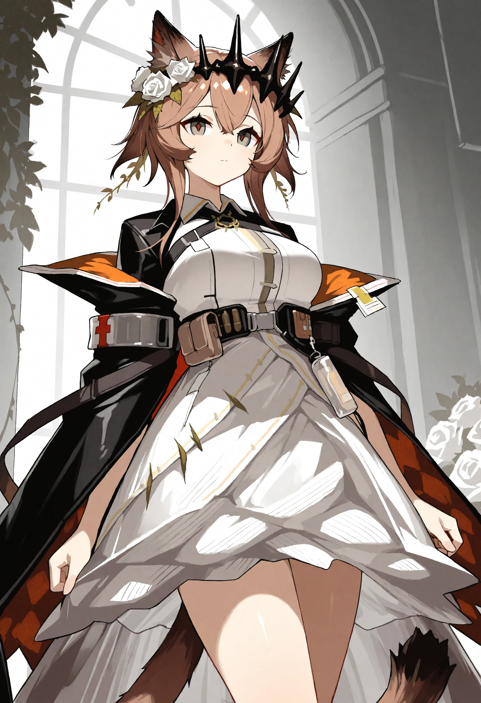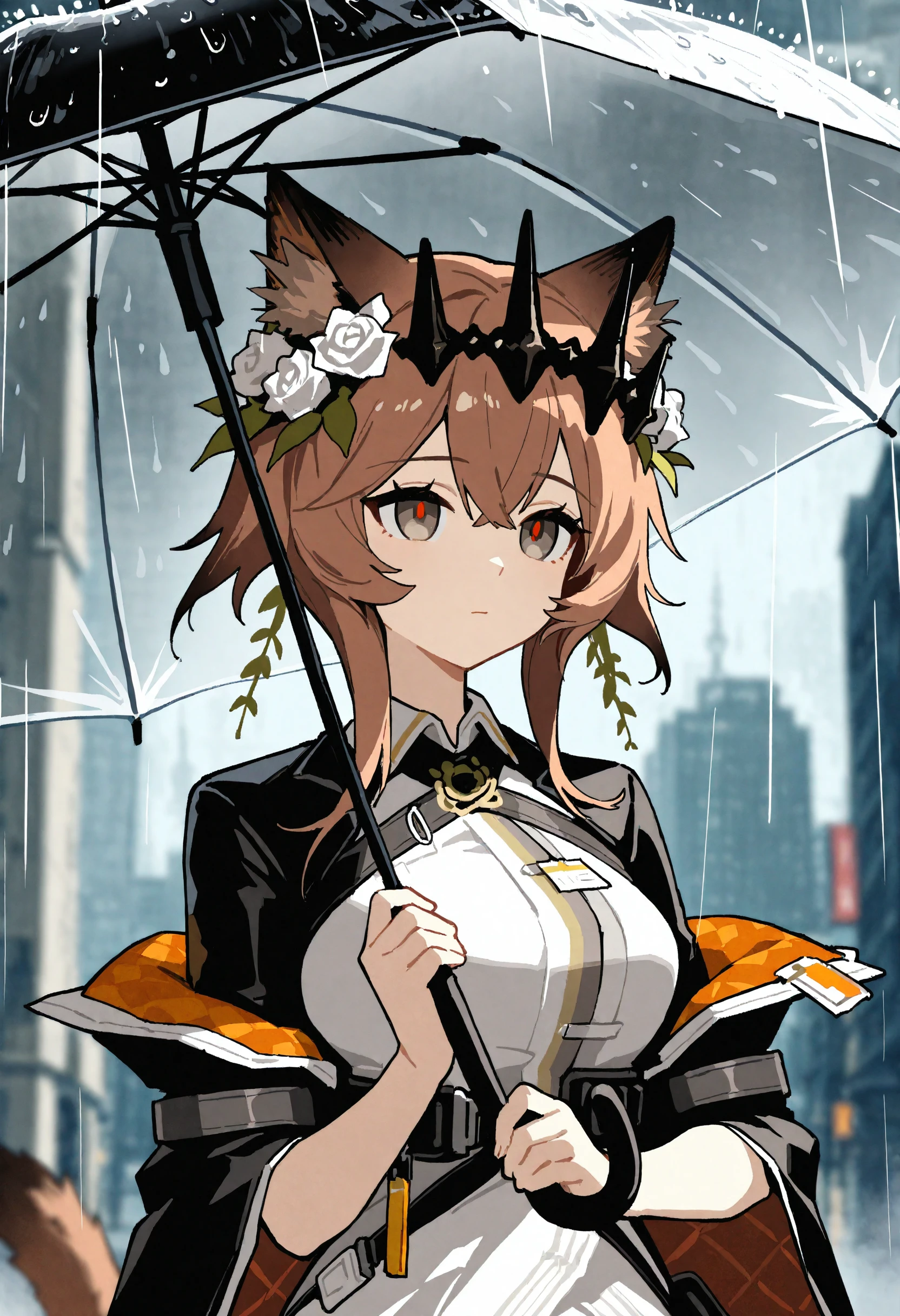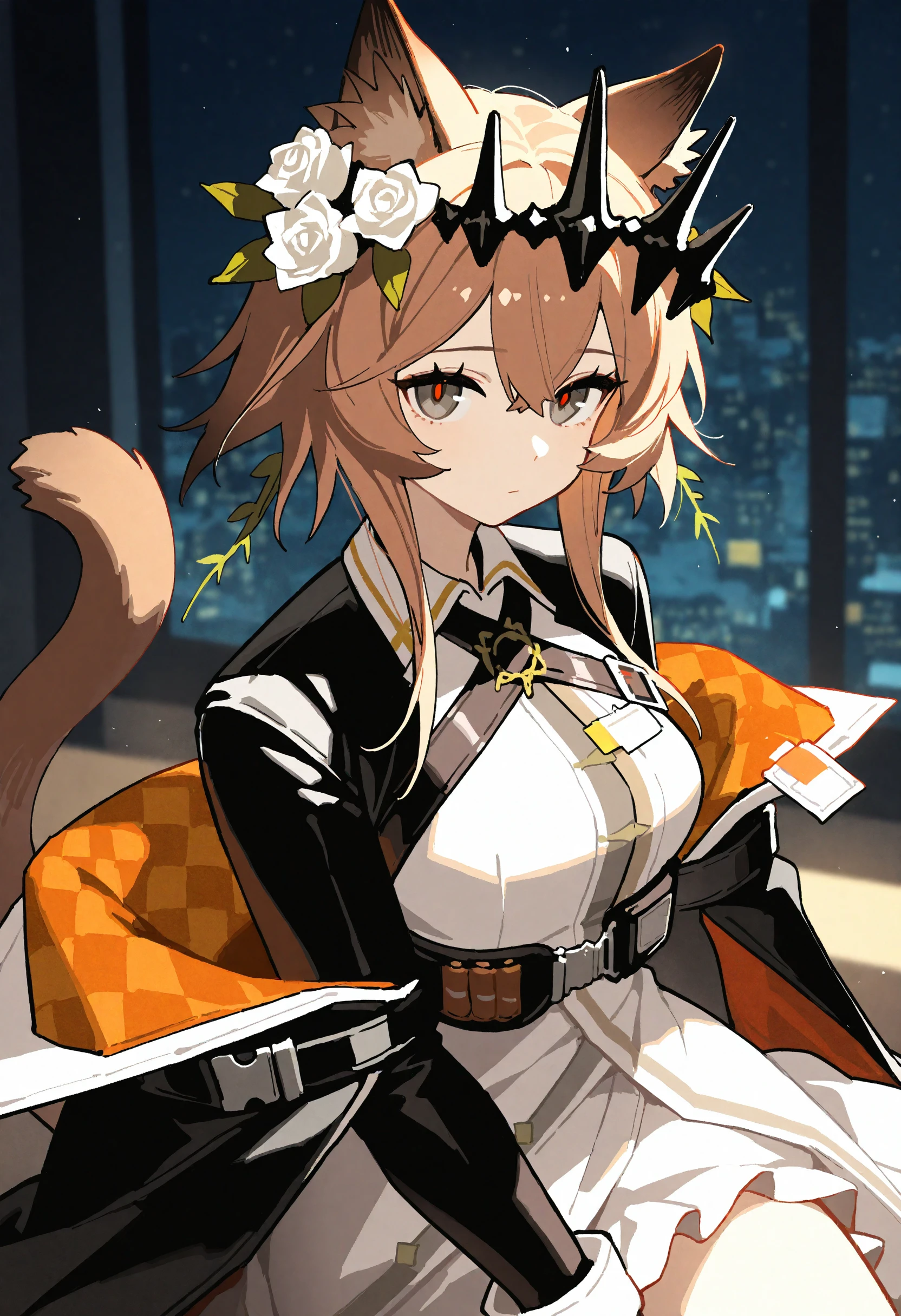 vendela_(arknights), 1girl, hair ornament, animal ear fluff, brown hair, cat ears, cat tail, red pupils, grey eyes