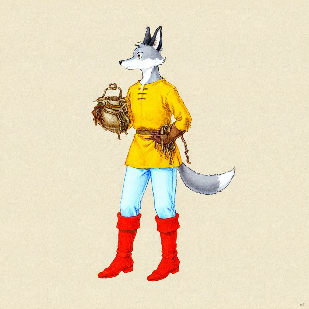 Fox boy Yellow tunic Blue pants red Boots furry body