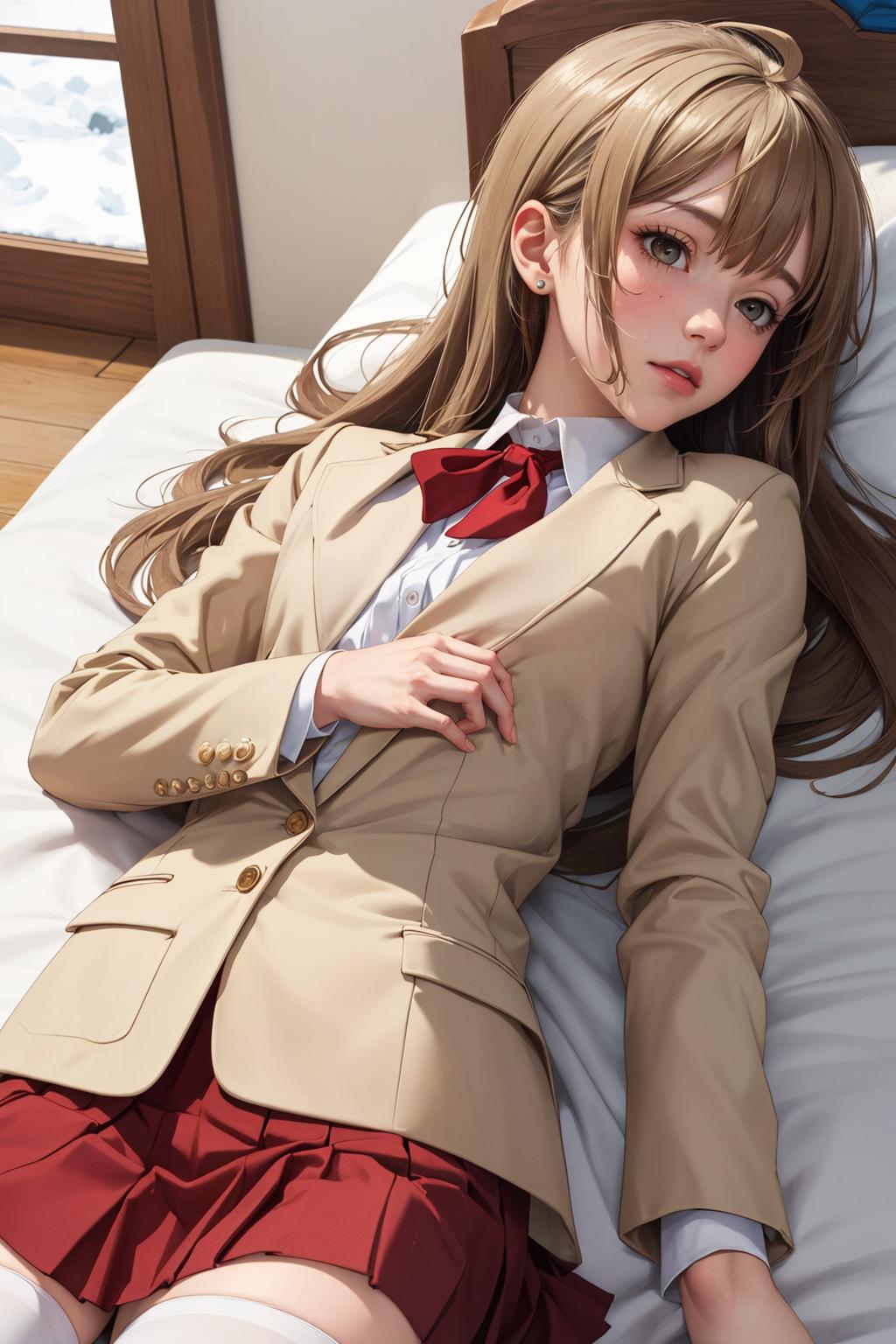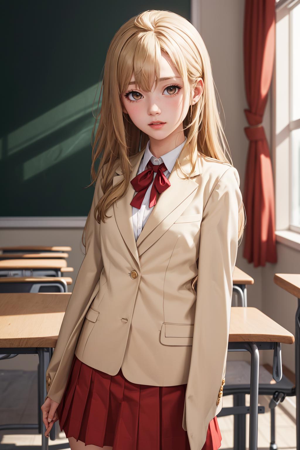 school uniform, beige blazer, neck ribbon, red skirt, black thighhighs