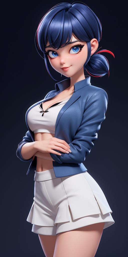 Dark blue, bob-cut hair with a ponytail, red mask with black spots, greenish-blue eyes, smiling expression, red suit with black spots