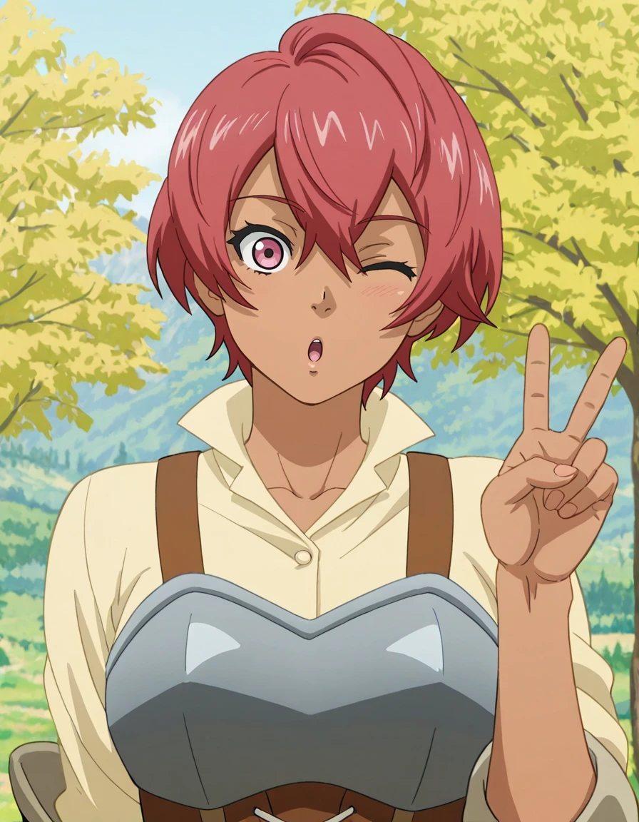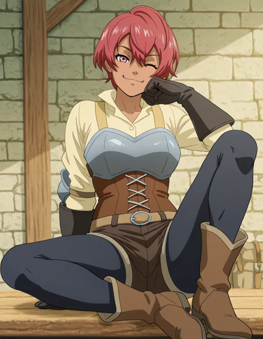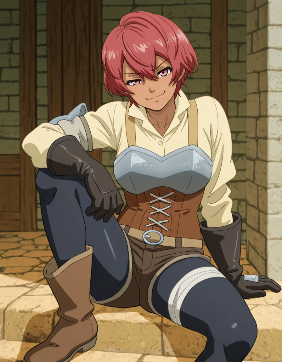 tondemorita, dark-skinned female, red hair, short hair, pink eyes, yellow undershirt, leather corset, chest armor, pauldron, long leather gloves, brown shorts, black leggings, brown boots, bandage on one leg