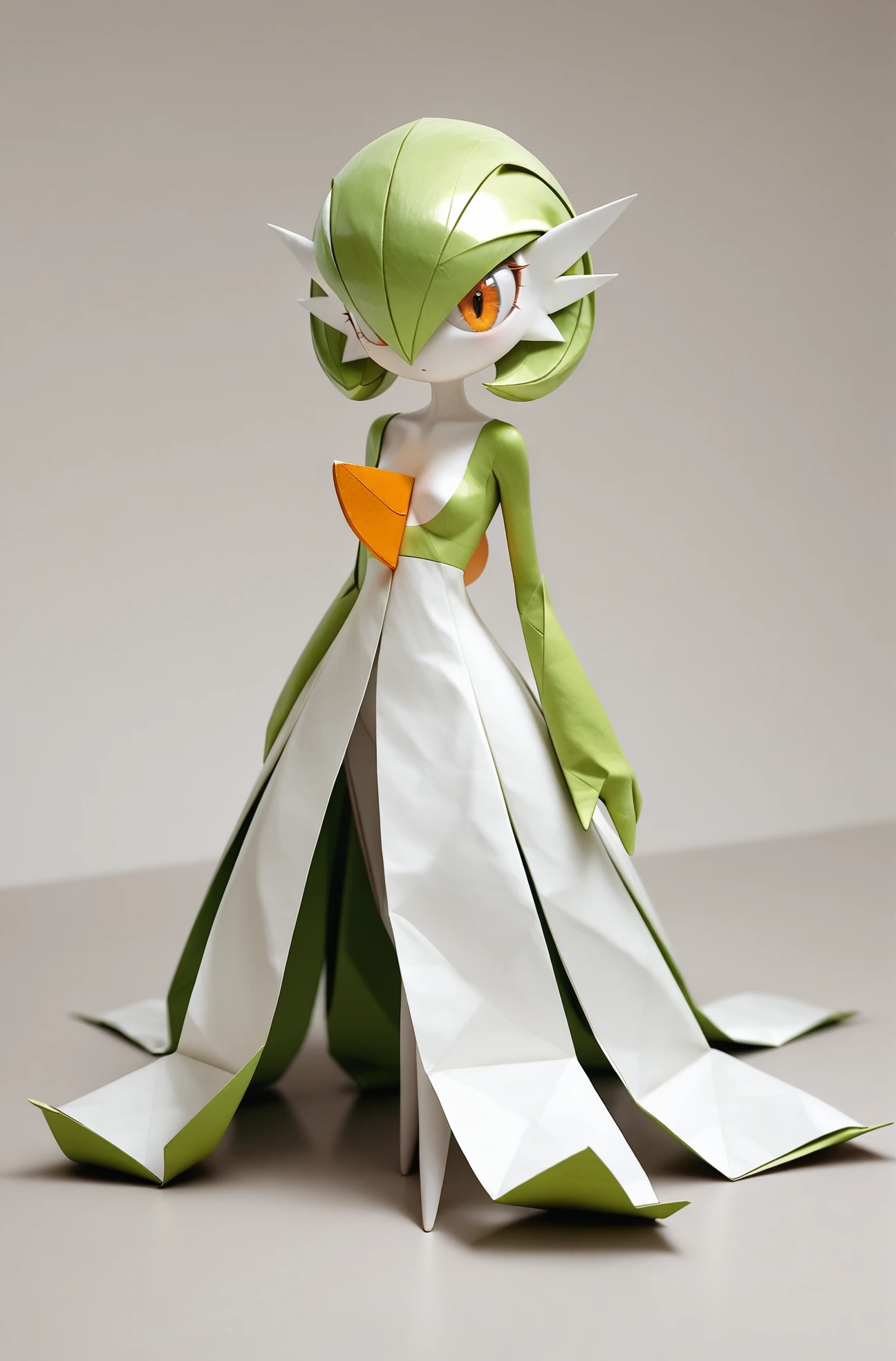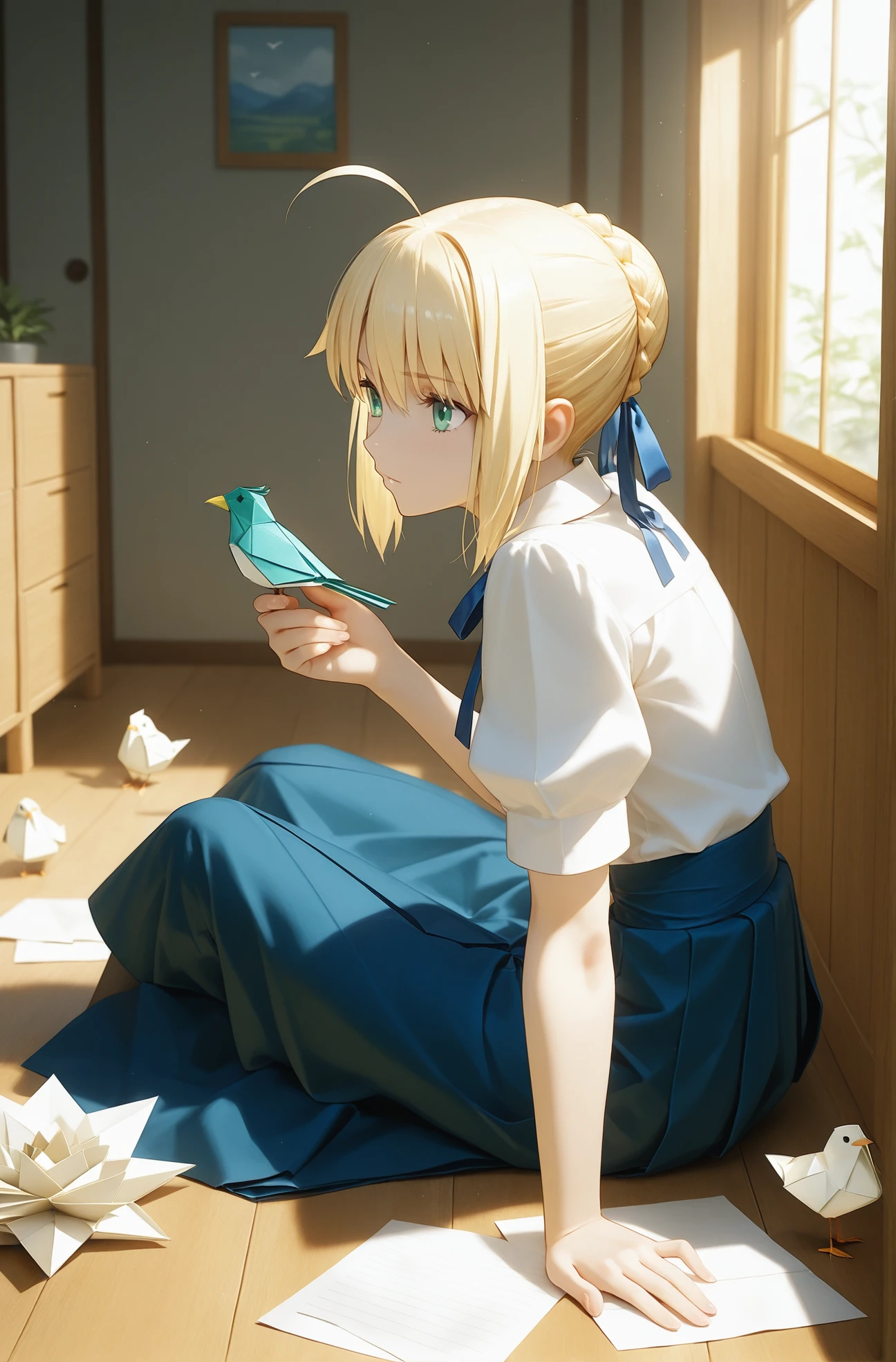 e.g.2 Prompt: origami, saber, fate_(series), 1girl, blonde_hair, solo, full body, green eyes, blue dress, white shirt, blue ribbon