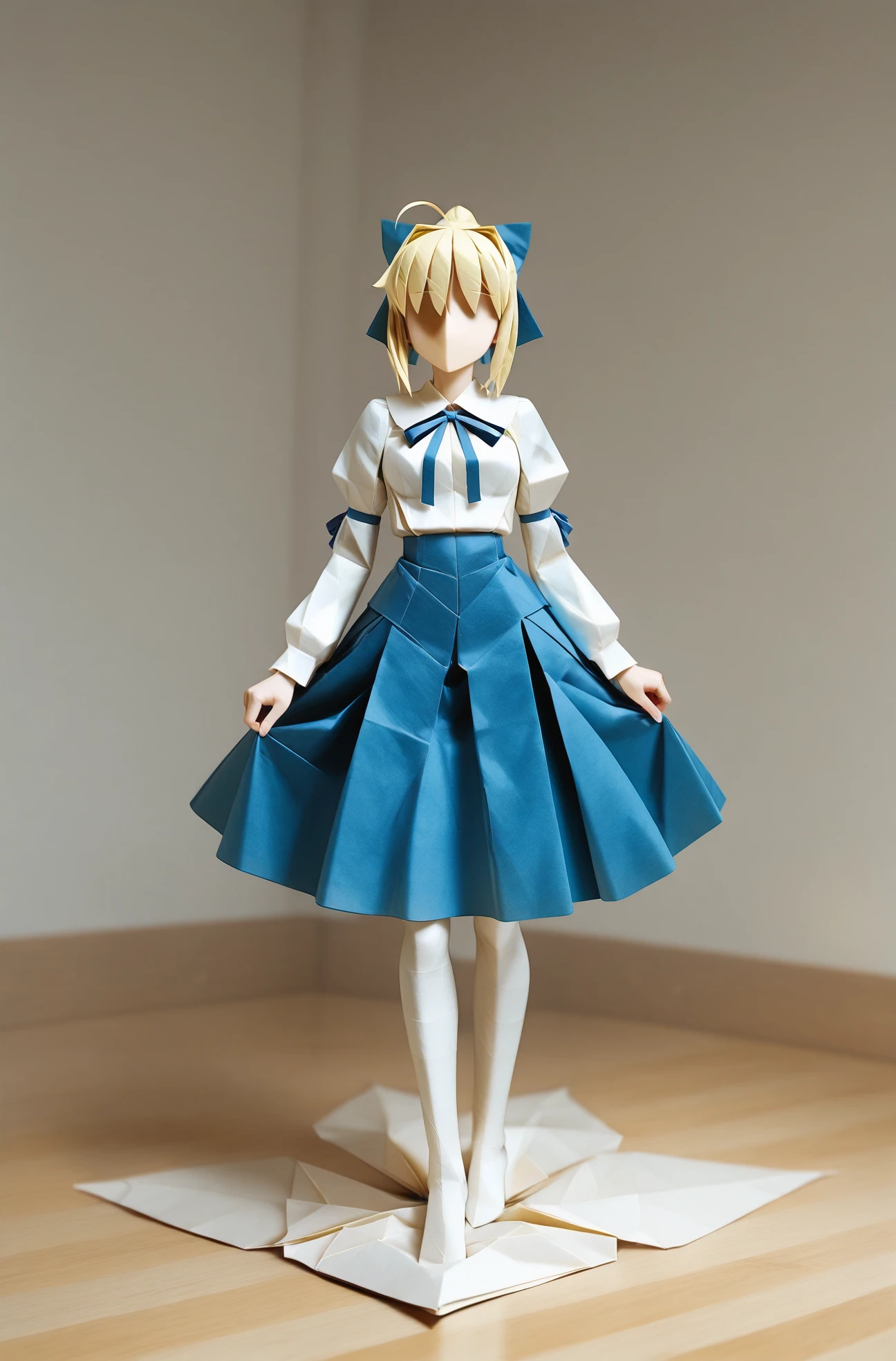 e.g.1 Prompt: origami, saber, fate_(series), 1girl, blonde_hair, solo, full body, , faceless, blue dress, white shirt, blue ribbon