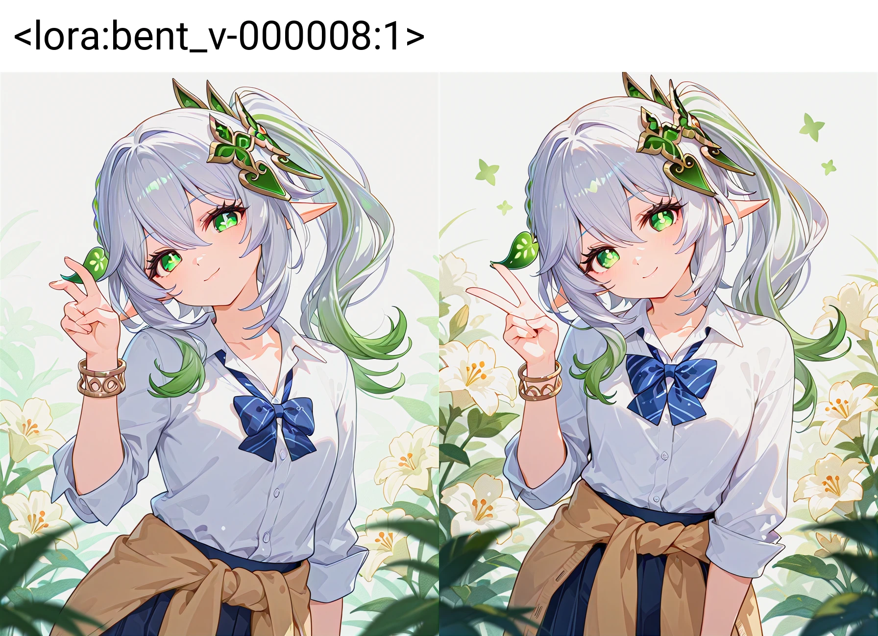 This LoRA outputs the bent-finger v sign. Use it when the regular v is too energetic.