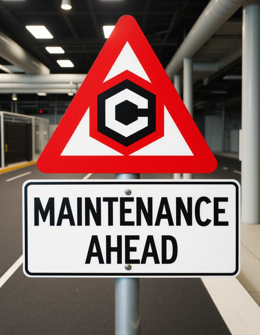 The image is a photograph taken in daylight, capturing a roadside sign. The sign is a triangular shape with a red border and a white background. The top part of the sign features a black silhouette of a civitaiLogo with a slash diagonally across it, indicating prohibition. Below this, there's a rectangular sign with white text on a black background that reads "MAINTENANCE AHEAD" in bold, uppercase letters. The sign is mounted on a silver pole and is positioned on the right side of a paved road.