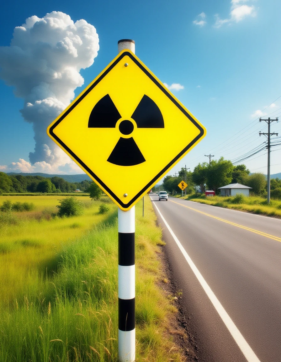 This photograph captures a vivid scene of a rural road with a prominent warning sign. The focal point is a bright yellow diamond-shaped sign with a black radiation symbol, indicating a potential hazard zone. The sign is mounted on a white and black striped pole positioned slightly off-center to the right side of the image. There is a nuclear explosion mushroom cloud in the background.