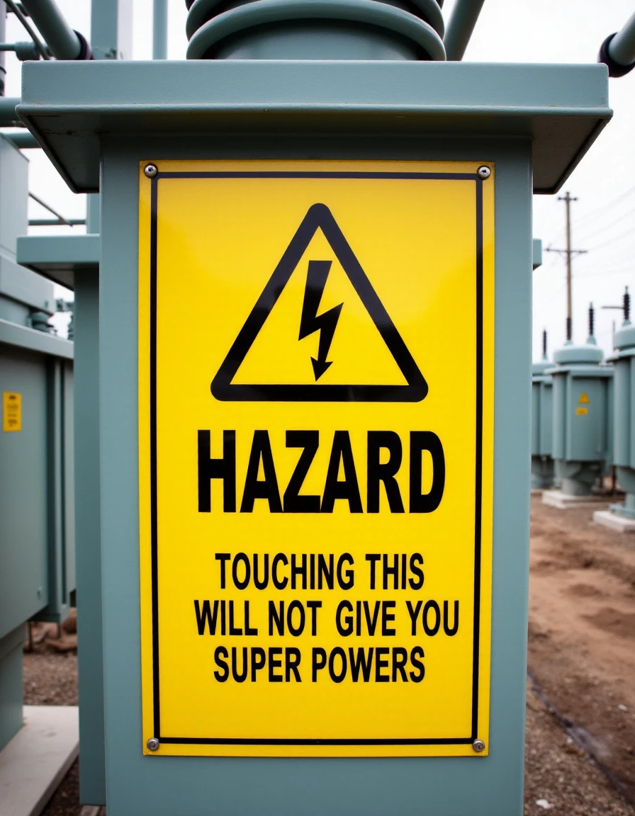 The image is a high-resolution photograph taken in an electrical station site. The central focus is a bright yellow safety sign mounted on an electrical transformer. The sign is rectangular with a black border and features a black lightning bolt icon and the word "HAZARD" in bold, capital letters. Below this, in smaller text, it reads: "TOUCHING THIS WILL NOT GIVE YOU SUPER POWERS." The sign's design is clean and professionally printed, with a slightly textured surface giving it a matte finish.