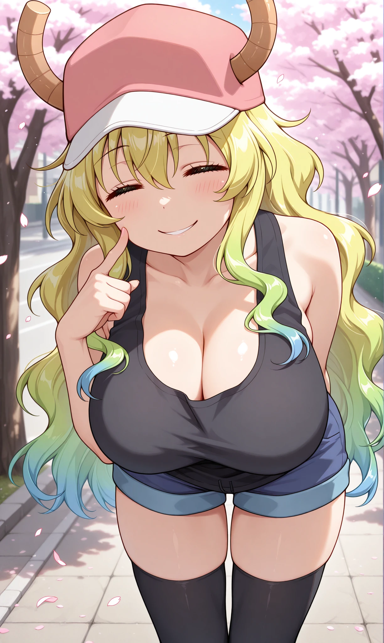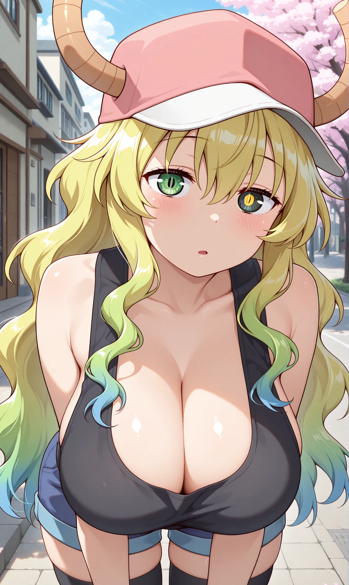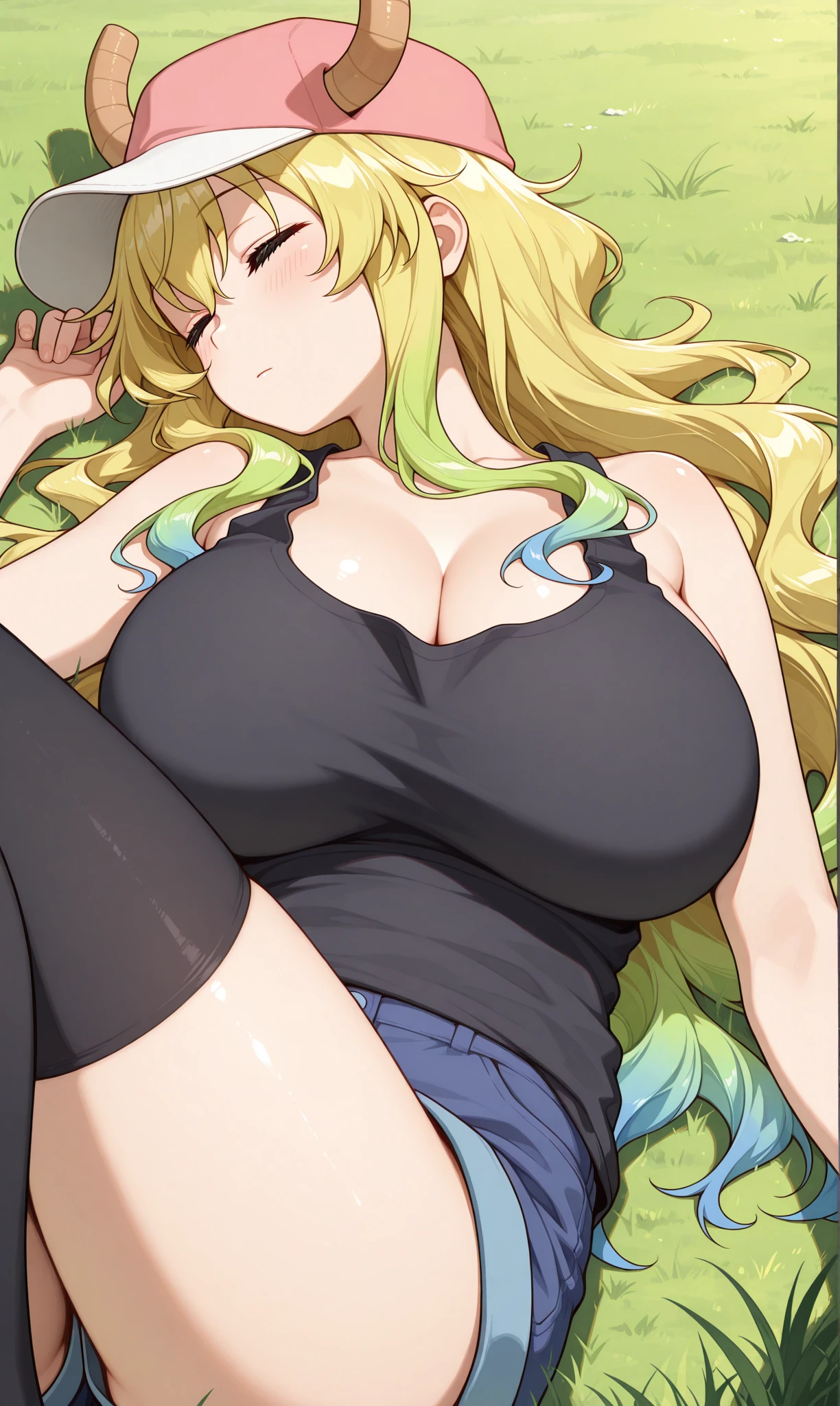 lucoa (maidragon), closed eyes, smile, blonde hair, long hair, gradient hair, blue hair, dragon horns, baseball cap, horns through headwearblack eyes, green eyes, heterochromia, slit pupils, yellow pupils, mismatched eyes, unusually open eyes๐ข๐๐๐ณ๐ถ๐: