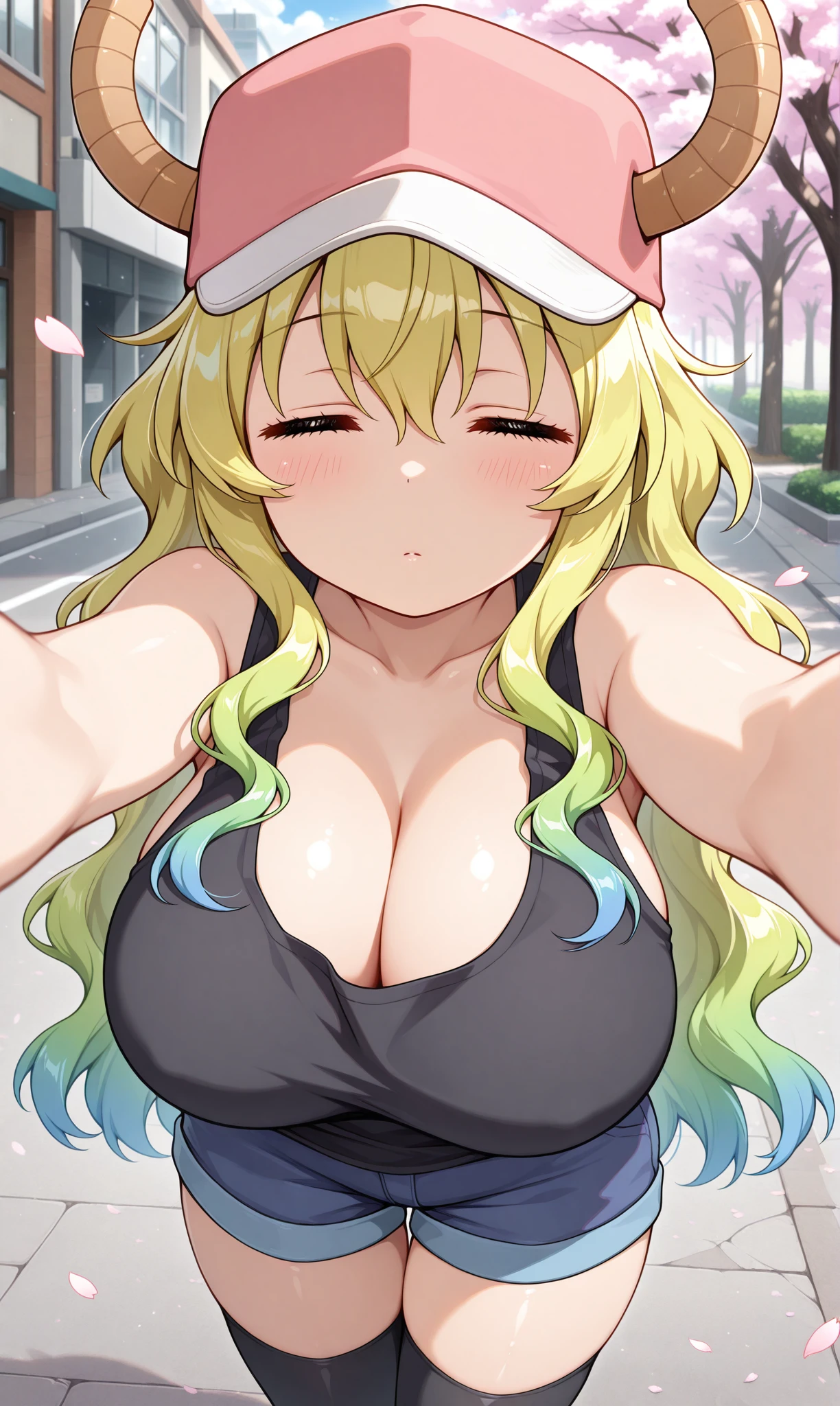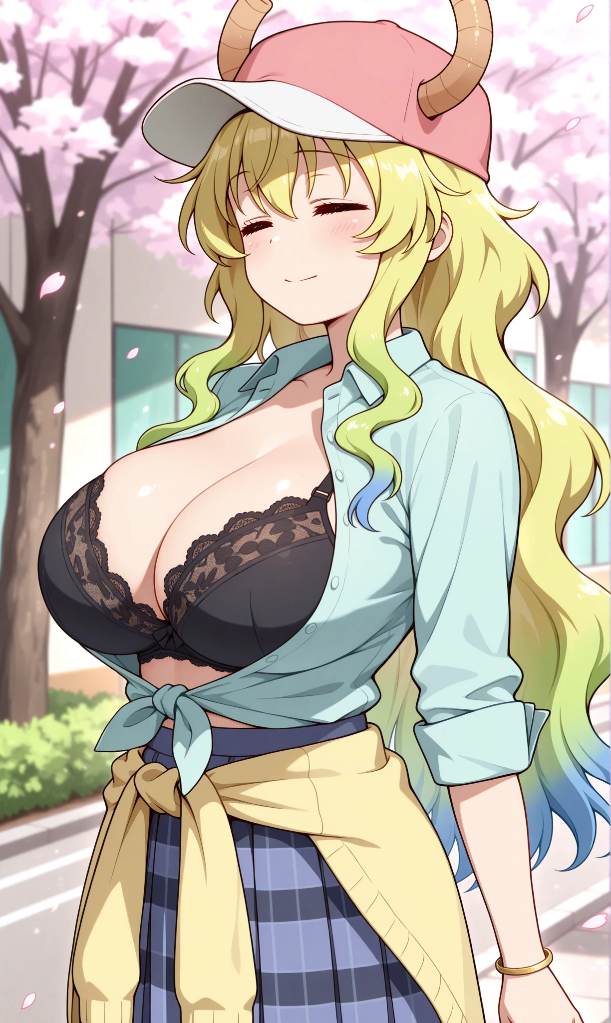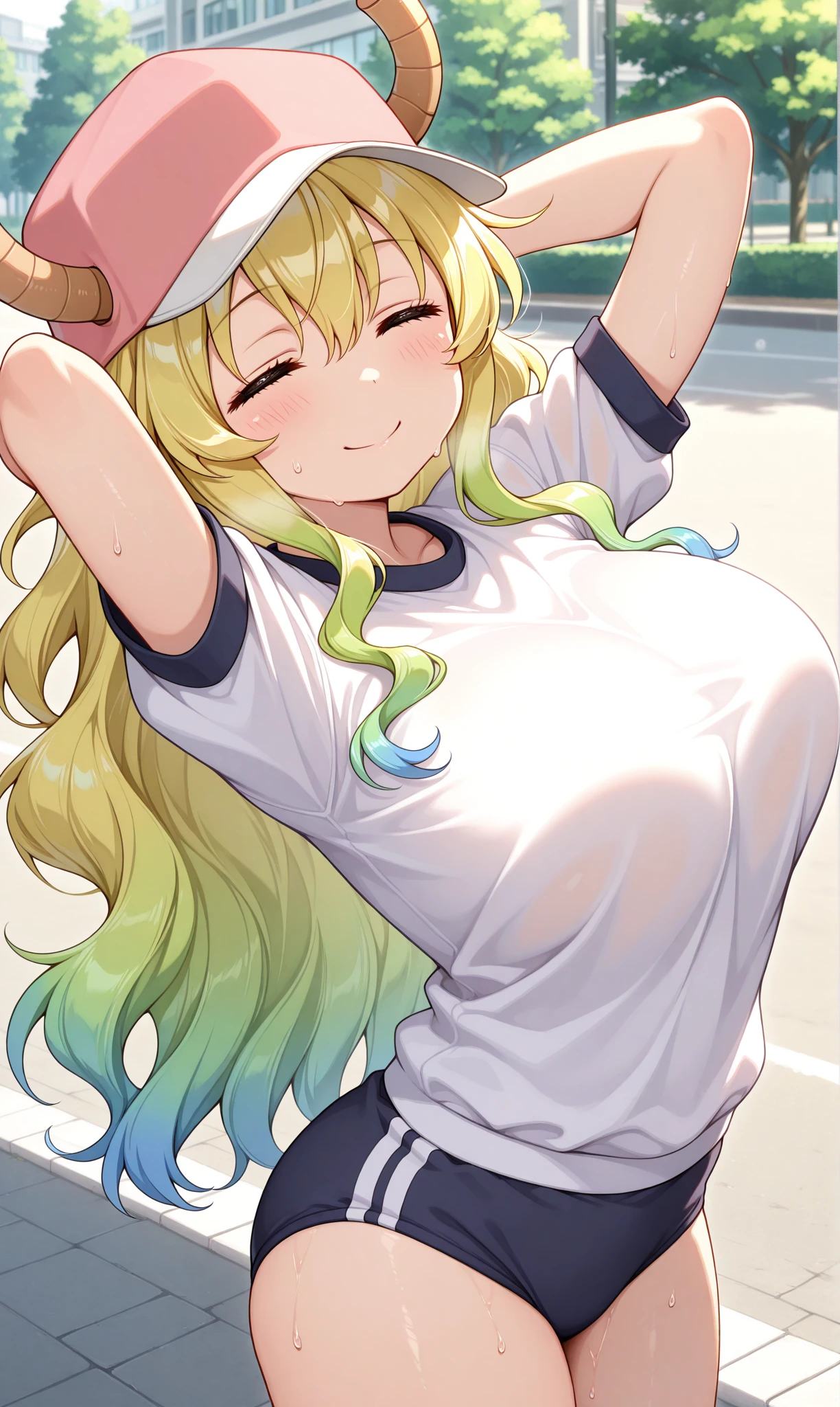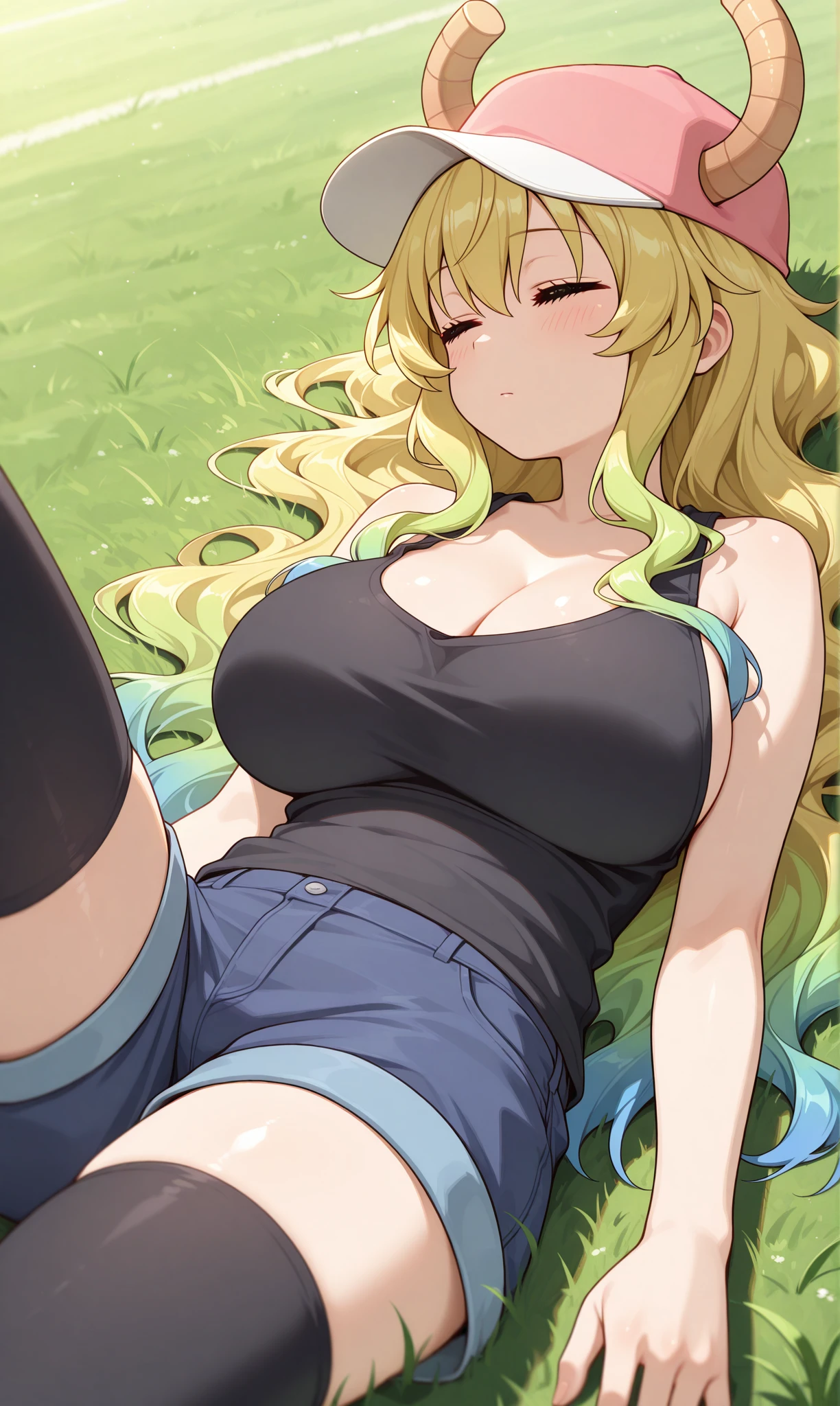 lucoa (maidragon), closed eyes, smile, blonde hair, long hair, gradient hair, blue hair, dragon horns, baseball cap, horns through headwear