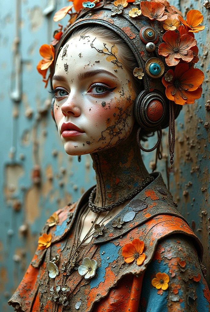 > "Close-up of a face assembled from scraps of old letters and fabric, emotional expression, mixed media style, detailed paper texture, Flux style"