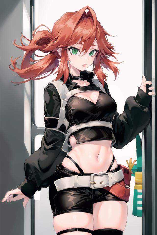 gachiakuta riyou, 1girl, solo, thighhighs, navel, jacket, shorts, midriff, crop topSupporte me with a coffee
