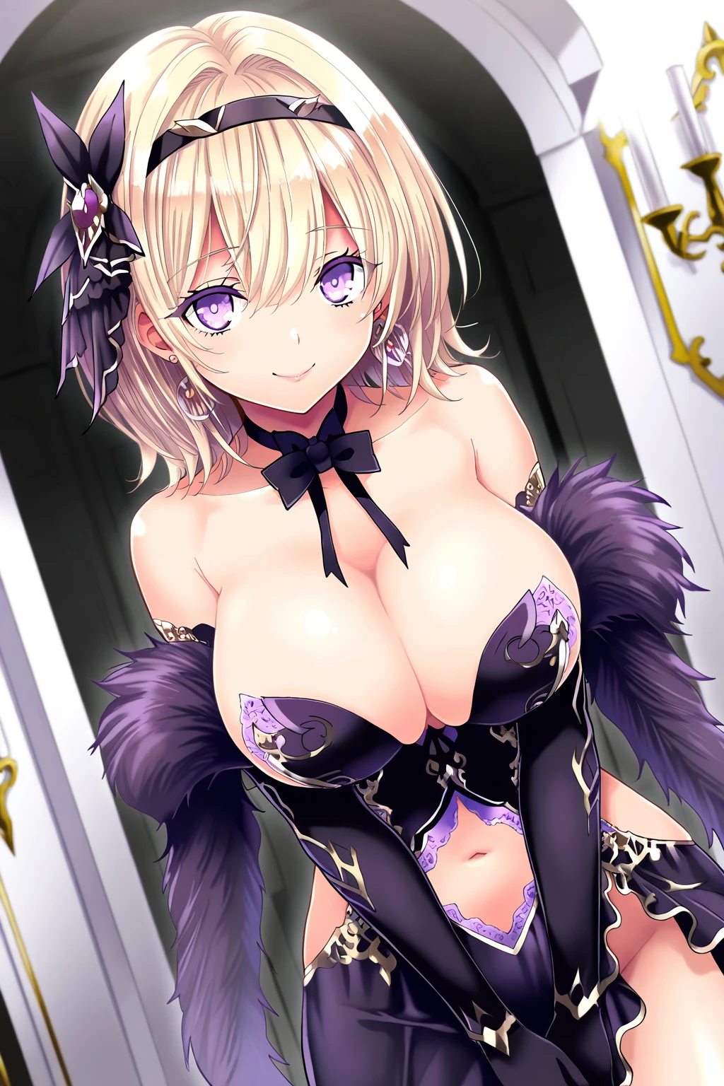 gs_db, 1girl, solo, purple eyes, short hair, blonde hair, , lips, hair ornament, hairband, earrings, jewelry, neck ribbon, cleavage, backless dress, side slit, no panties, feather boa, shoulders, elbow gloves, navel, thigh strap, high heels,