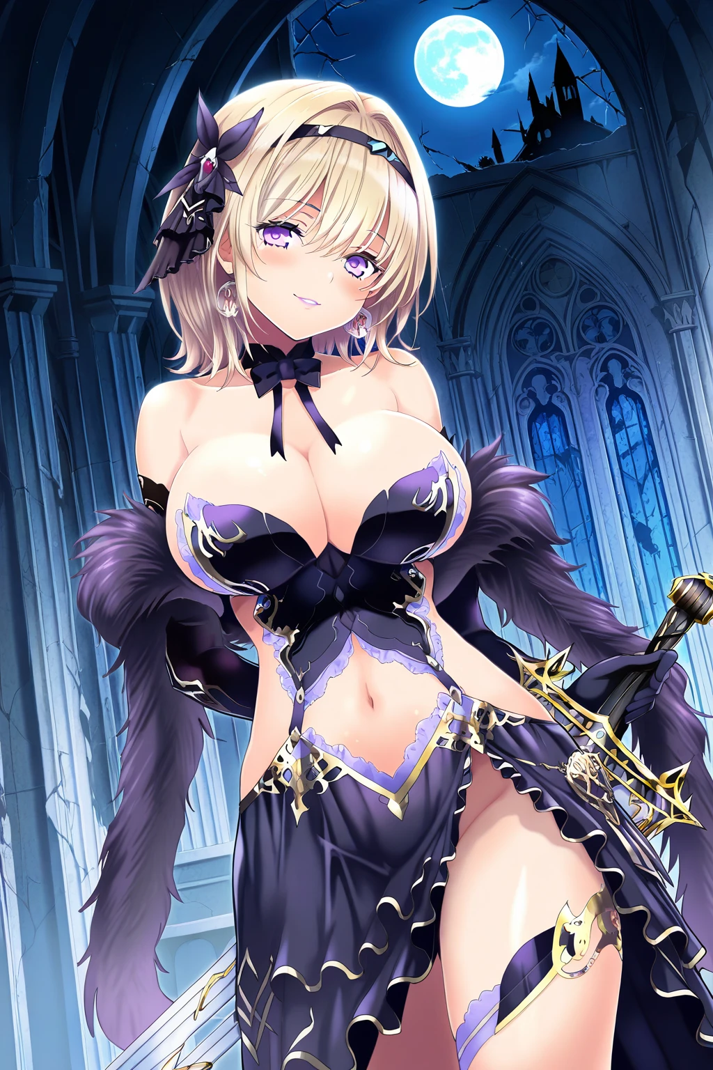 gs_db, 1girl, solo, purple eyes, short hair, blonde hair, large breasts, lips, hair ornament, hairband, earrings, jewelry, neck ribbon, cleavage, backless dress, side slit, no panties, feather boa, bare shoulders, elbow gloves, navel, thigh strap, high heels,