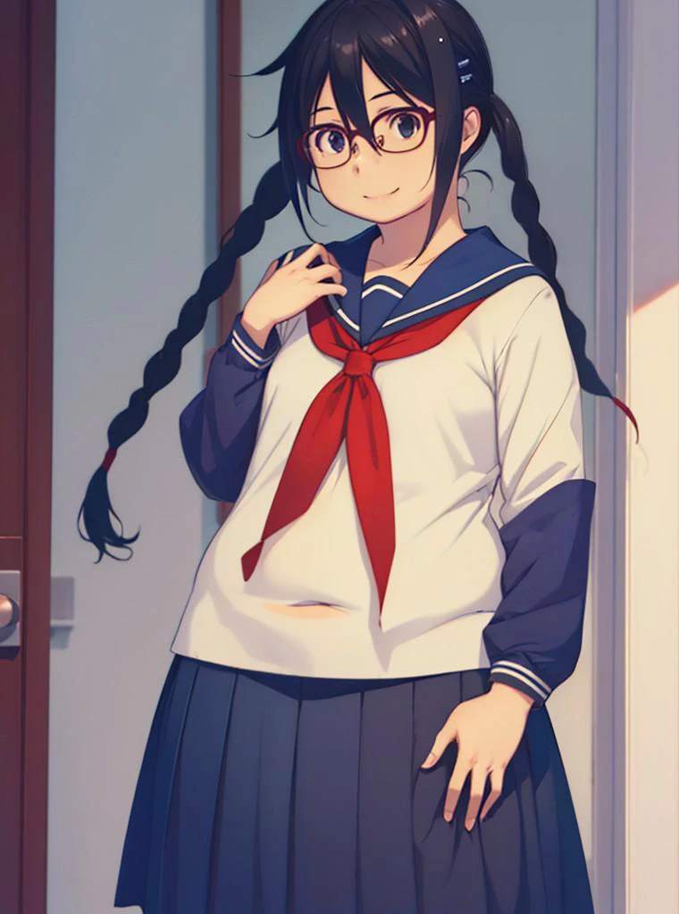 Clothes: loafers, red neckerchief, brown footwear, long sleeves, blue skirt, kneehighs, skirt, school uniform, blue sailor collar, serafuku, sailor collar