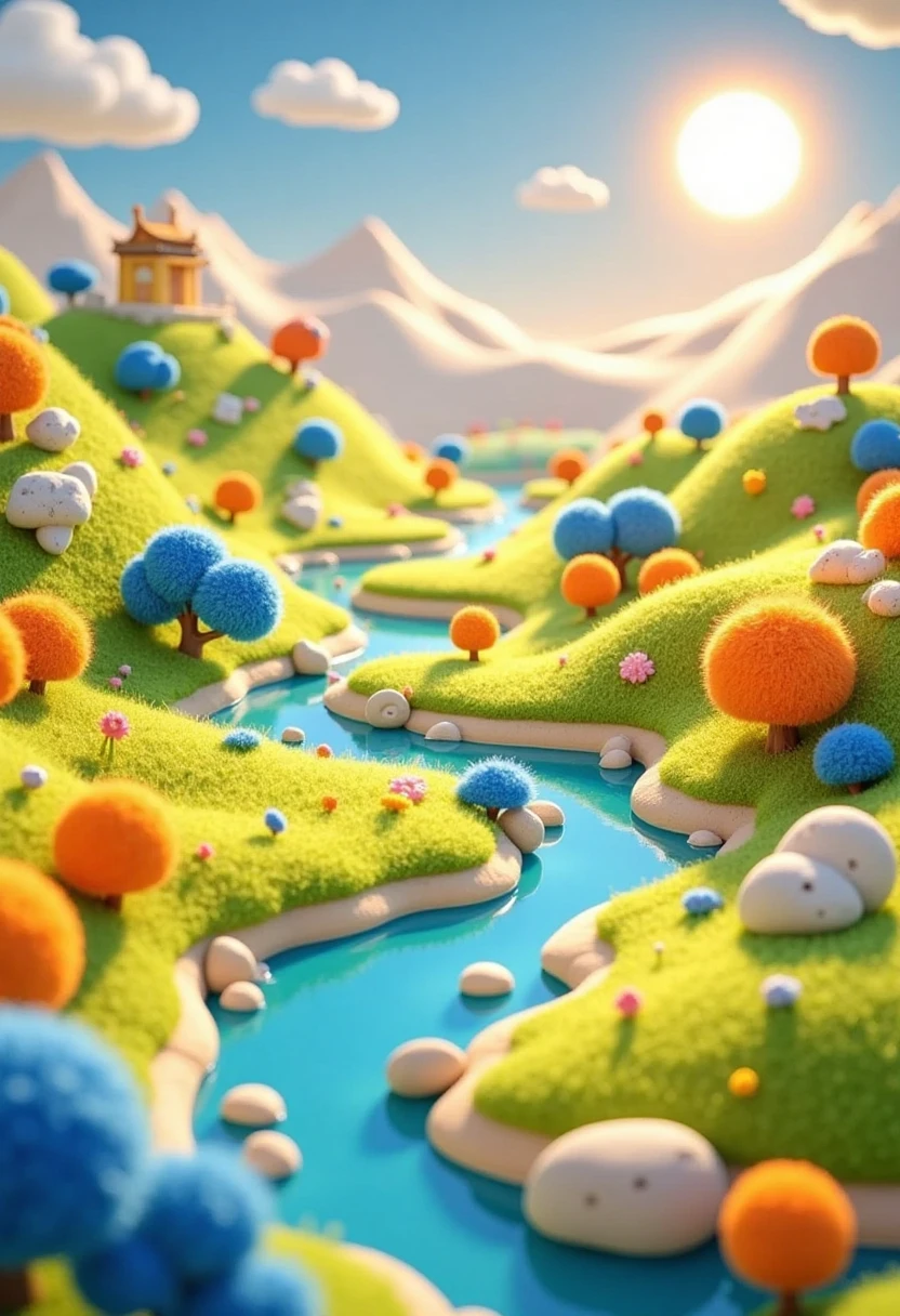 Miniature and vibrant 3D - style illustration of the Yellow River, a winding tiny river, small fertile plains, and sun - shaped, glowing orbs.