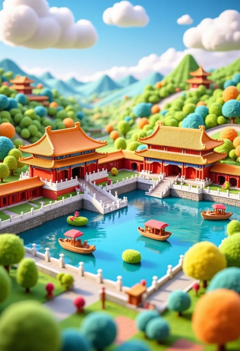 Miniature and vibrant 3D - style illustration of the Summer Palace, featuring small pavilions, Kunming Lake with tiny boats, and fluffy cloud - formed hills.