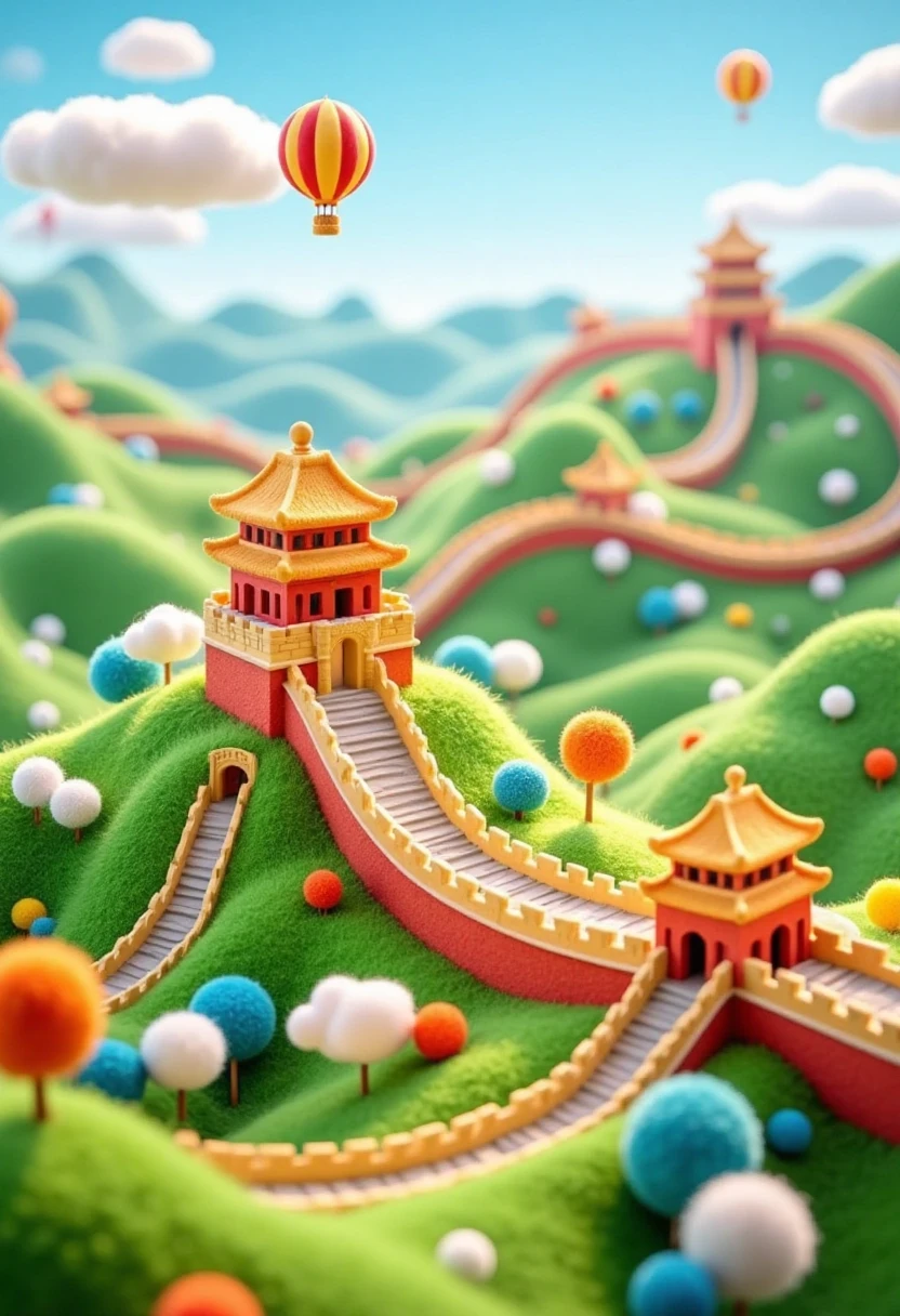 Miniature and vibrant 3D - style illustration of the Great Wall, winding with small watchtowers, green - hued mountains, and floating balloon - like clouds.