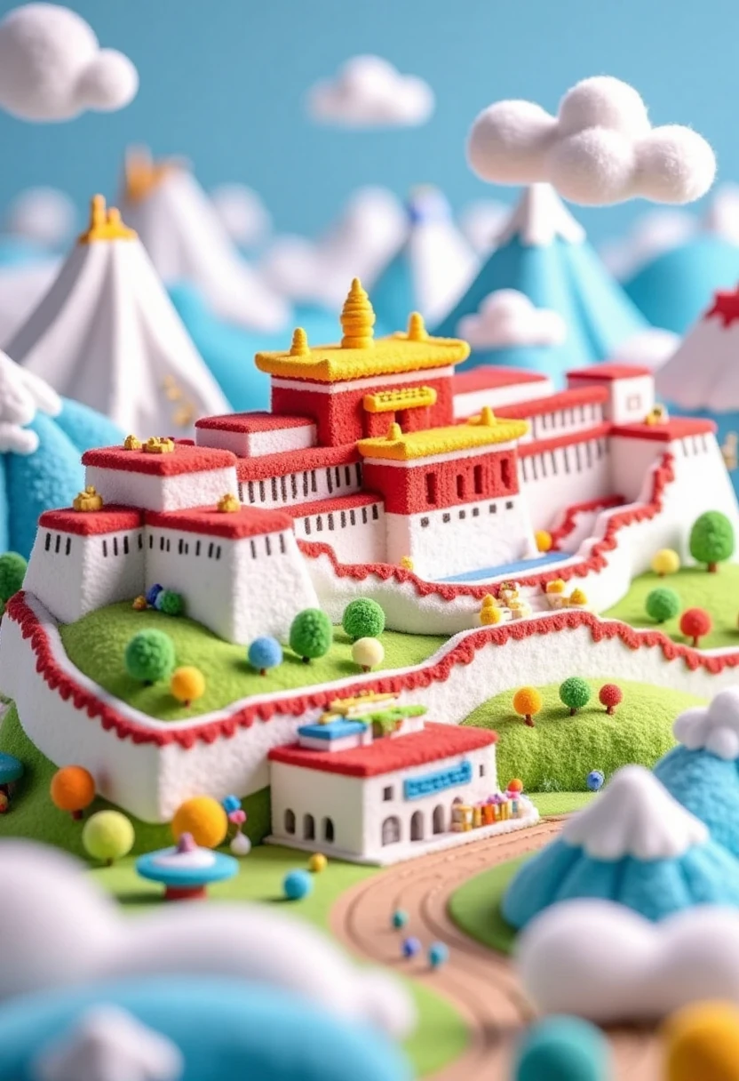Miniature and vibrant 3D - style illustration of the Potala Palace, tiny white and red structures, Himalayan - like small peaks, and prayer flag - shaped ornaments.